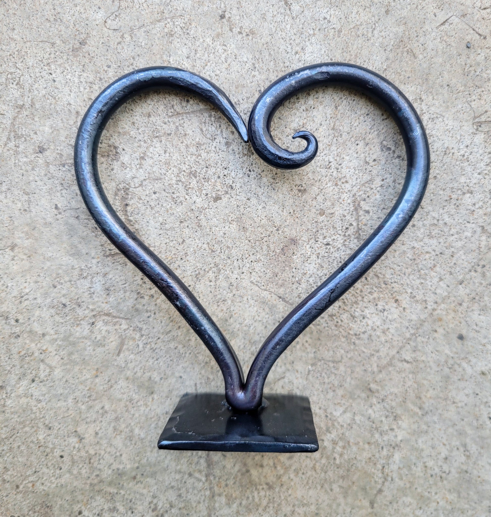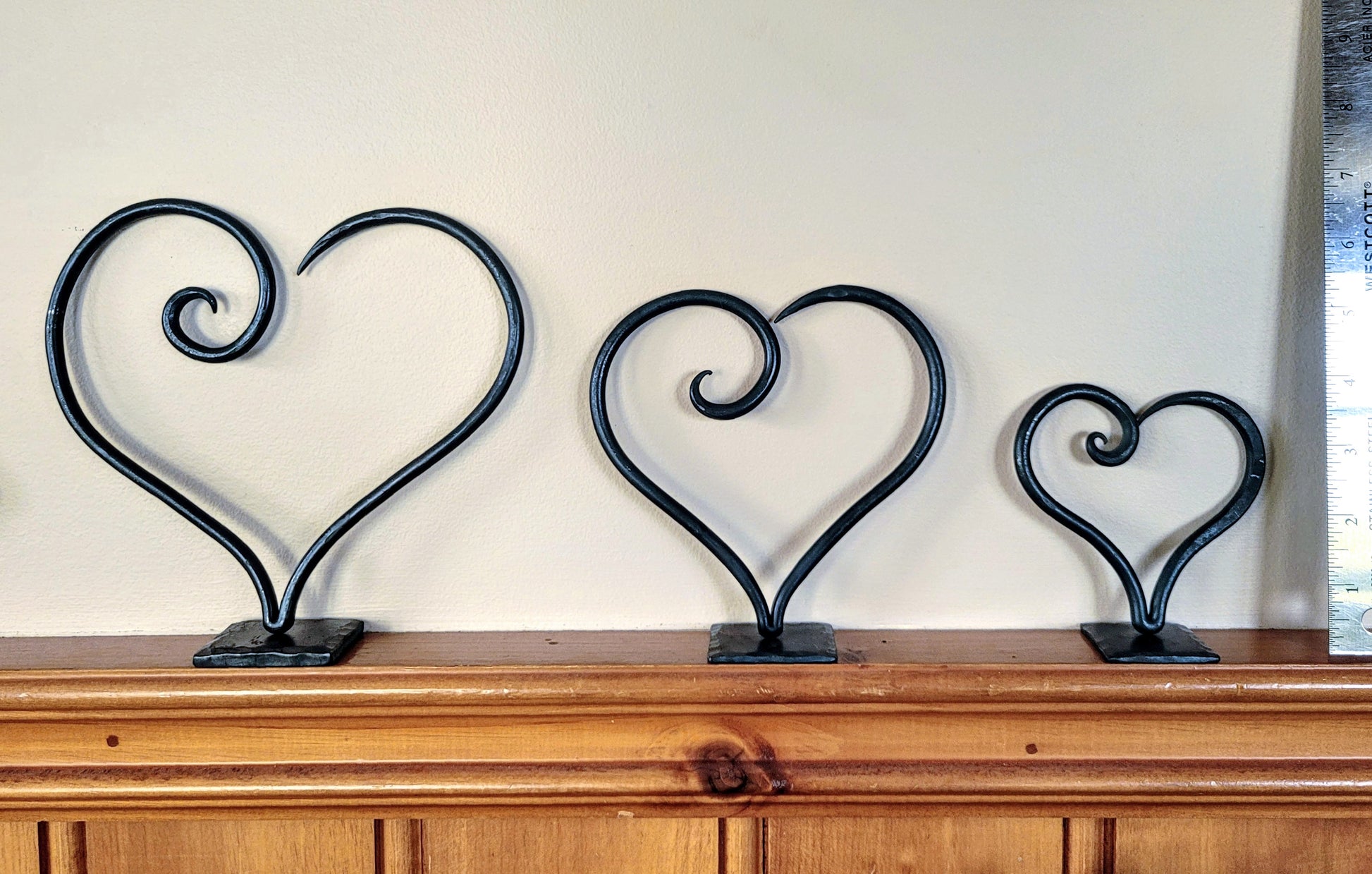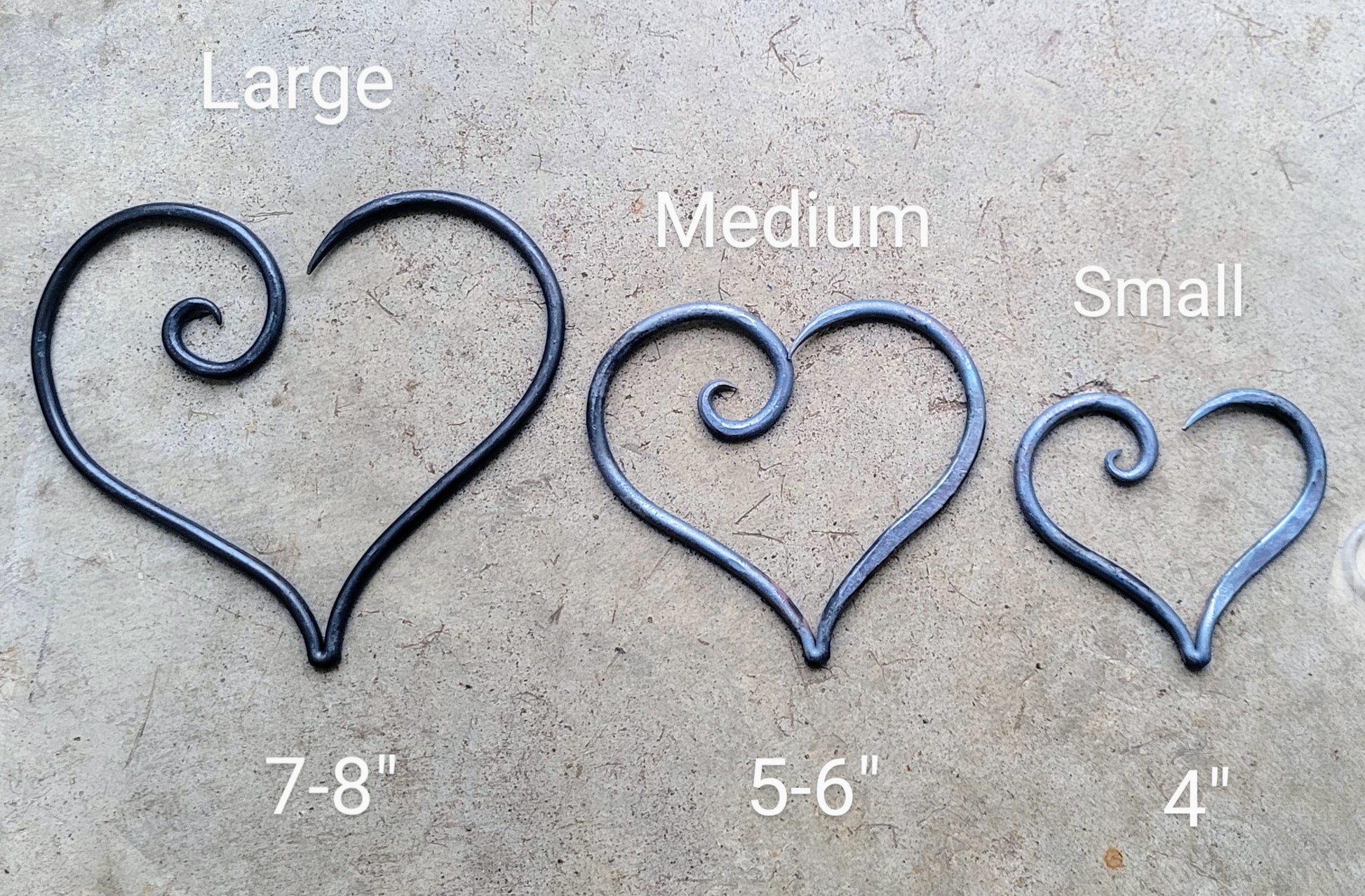 The small size sculpture measures approximately 4 inches in width and height. The medium size heart measures approximately 5.5 inches, and the large size heart measures approximately 7". Each heart is freestanding on its own welded steel base with hammered edges (smoother, modern style bases can be substituted on request)
