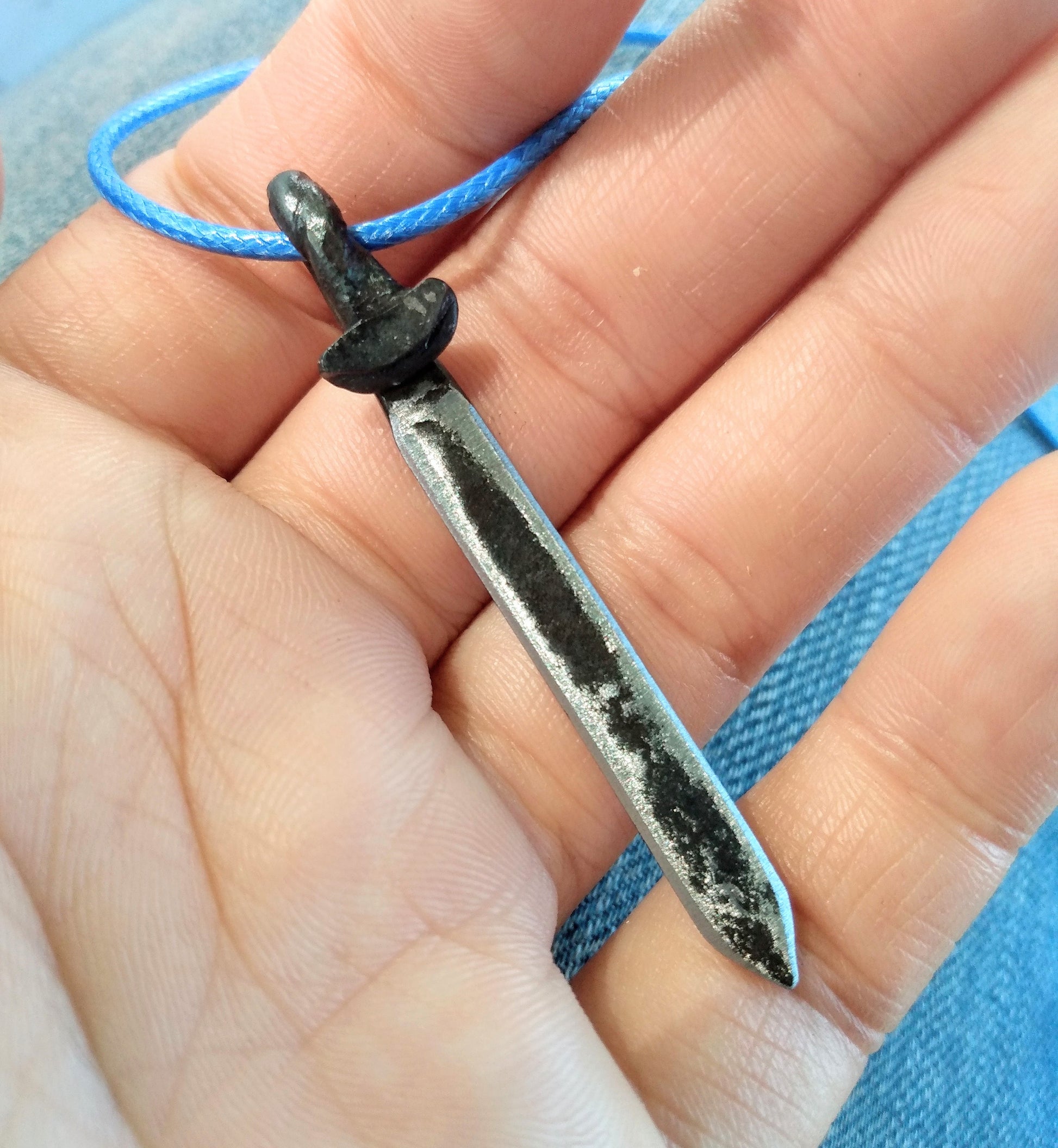 Show off your inner warrior with this unique forged steel sword necklace. These striking pendants are hand-forged in fire using modern and traditional blacksmithing tools and techniques. They are coated to resist rust and add a glossy sheen. Pendants measure approximately 2-3 inches in length and come on an 18" black cotton cord. Available in a straight-edged broadsword style or a curved Scimitar style sword.