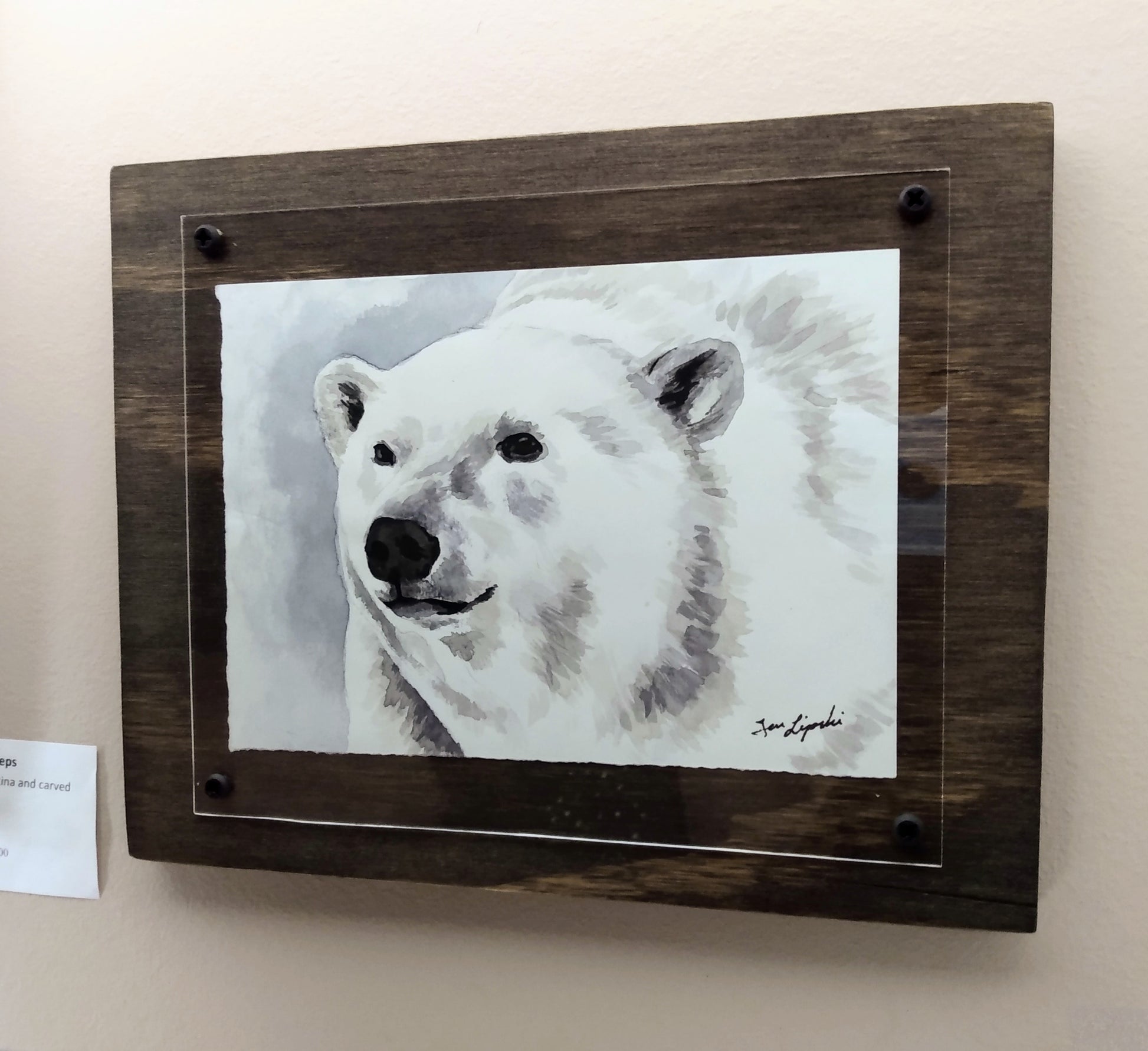 This small polar bear study is an original watercolour painting by Canadian artist Jen Lipski. It is amongst a series of small wildlife studies painted at Lake Aquitaine in 2017. This original watercolor and ink painting measures 5 x 7" and is personally signed by the artist. It is one of a kind and includes a handcrafted plywood frame with a dark walnut finish and protective acrylic cover