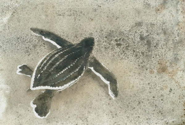 First Steps is an original Metal Drawing by artist Jen Lipski. The original work was created by painting with acid and lightly carving onto a sheet of steel. This artwork was inspired by Jen's experience rescuing leatherback hatchlings while volunteering with Ocean Spirits in Grenada. The original artwork is available for purchase, click here for details.