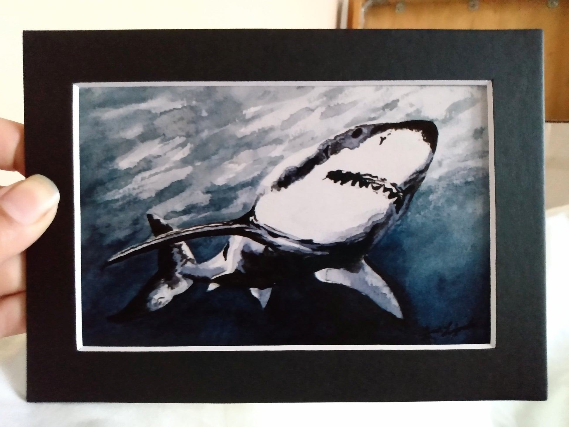 This dynamic shark study is an original watercolour painting by artist Jen Lipski. It is part of a series of small wildlife studies painted at Lake Aquitaine in 2017