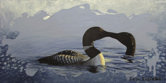 Kissing Loons is an original acrylic painting by artist Jen Lipski. This painting was inspired by her personal encounter with a pair of loons while cottaging on Lake Buckhorn in Southern Ontario.