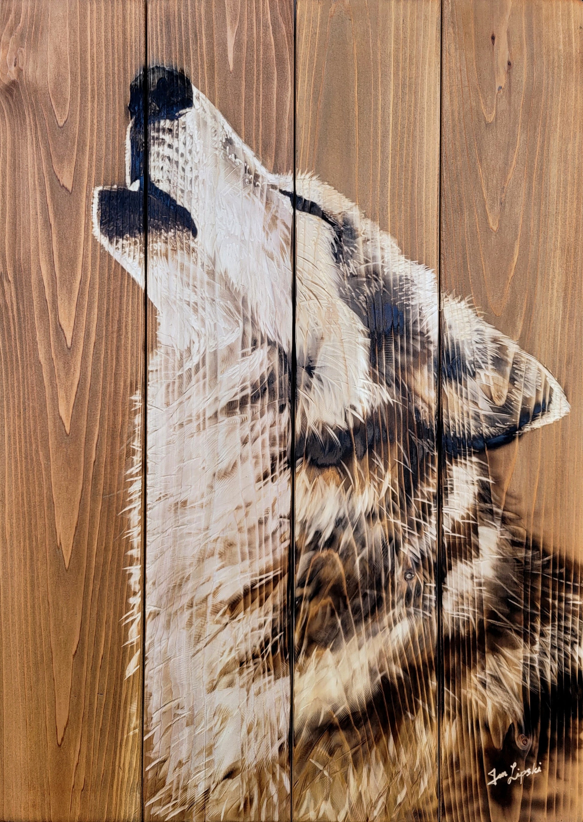This unique howling wolf portrait is burned and carved into a canvas of cedar wood panels. It was the first of a set of 3 burned wolf portraits completed in Spring 2022