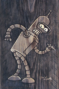 This unique painting is burned and carved into wood, inspired by Bender from Futurama. Also check out Nibbler and the Hypnotoad!