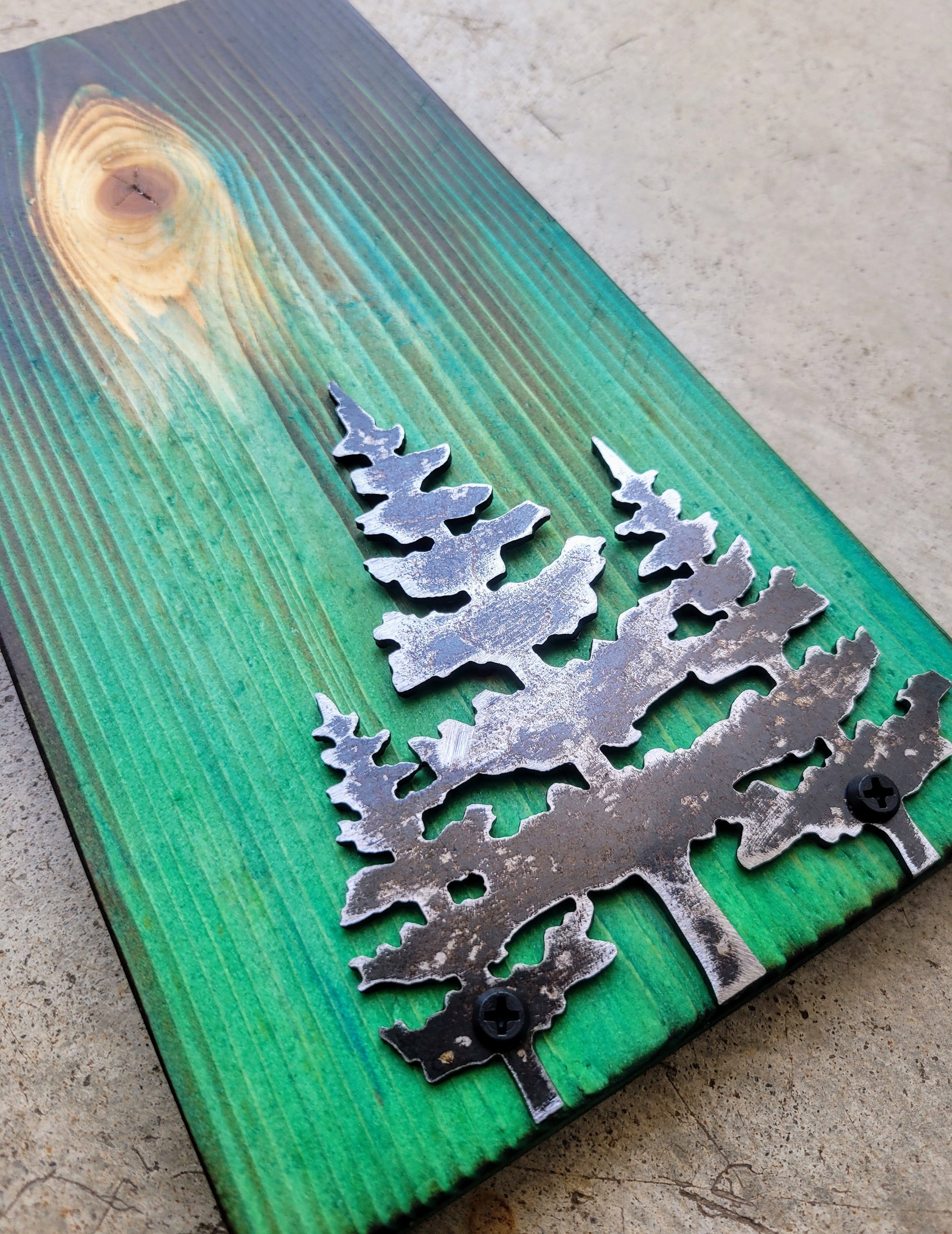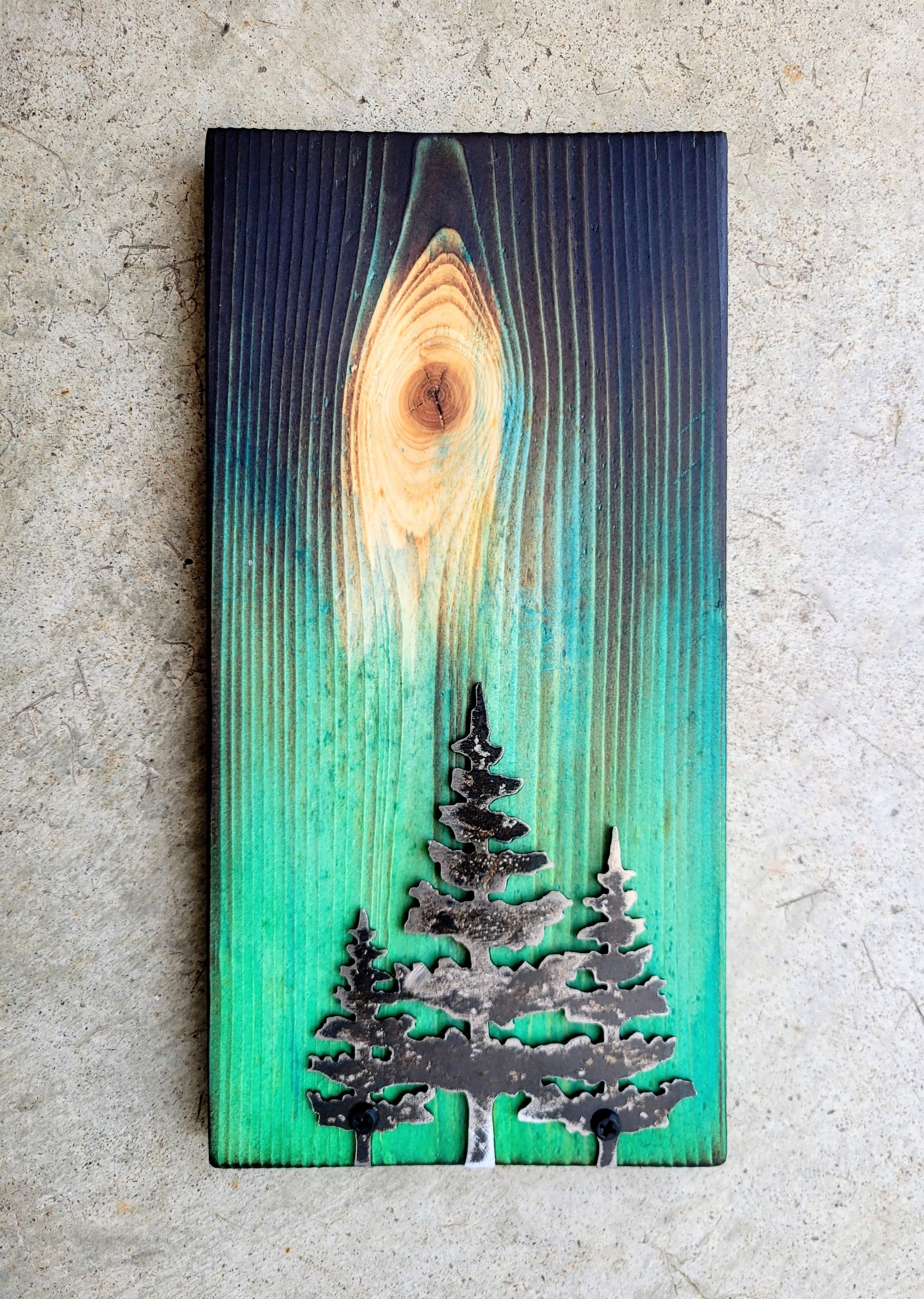 This handcrafted artwork features a burned and stained on wood background inspired by the northern lights, showcasing a silhouette of plasma-cut metal trees. The artwork measures approximately 5 x 11 inches and is ready to hang on your wall with a sawtooth-style picture hanger installed on the back. The colours wrap around the sides of the wood and so no frame is necessary, just hang it from a hook or nail on your wall!