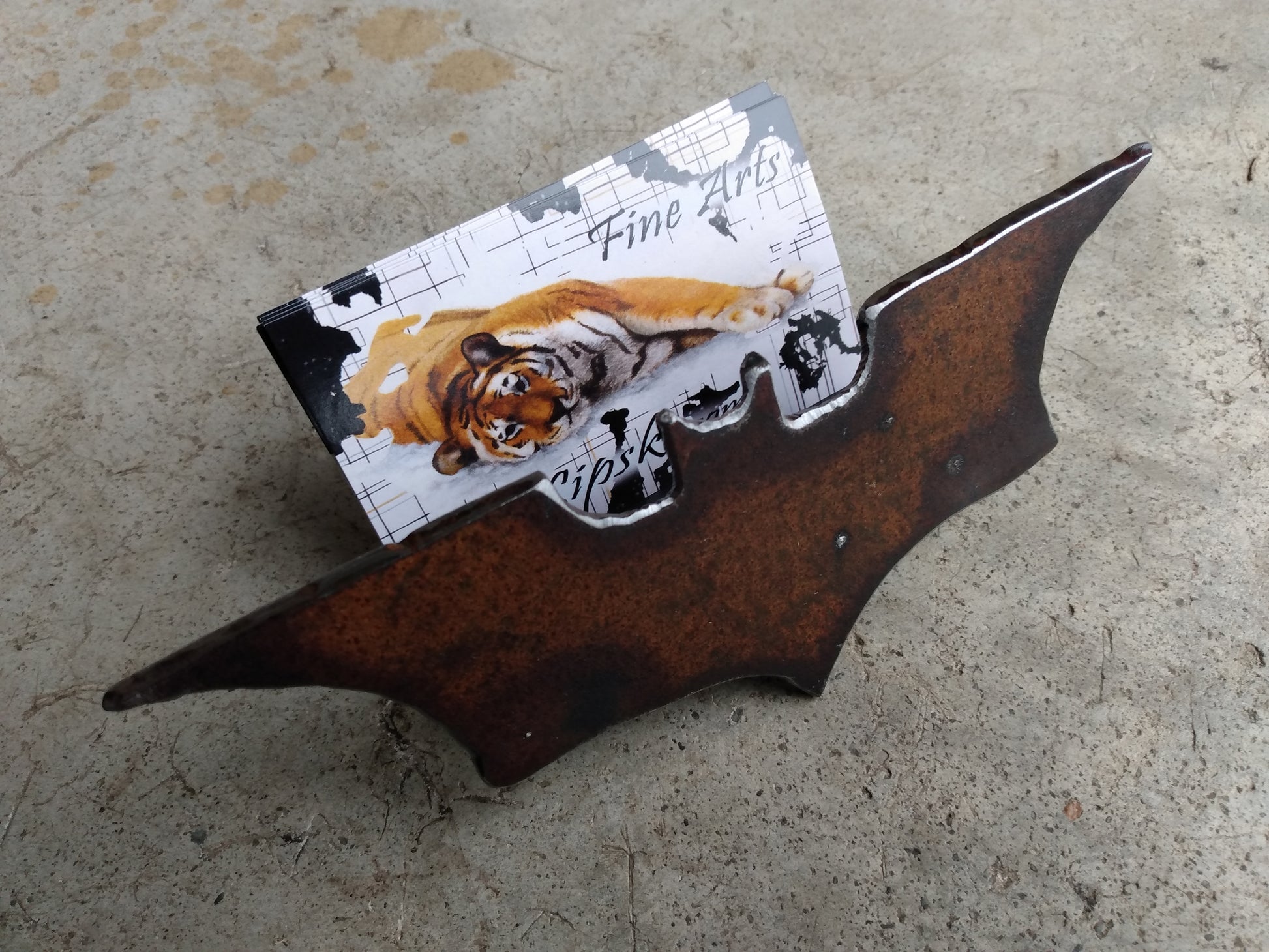 These bats have a wingspan of approximately 5" and hold a stack of standard size business cards in behind. Each bat is hand-cut from solid steel, so every one is unique and may look slightly different than those pictured. Personal Inscription available on front of bat (up to 24 characters)