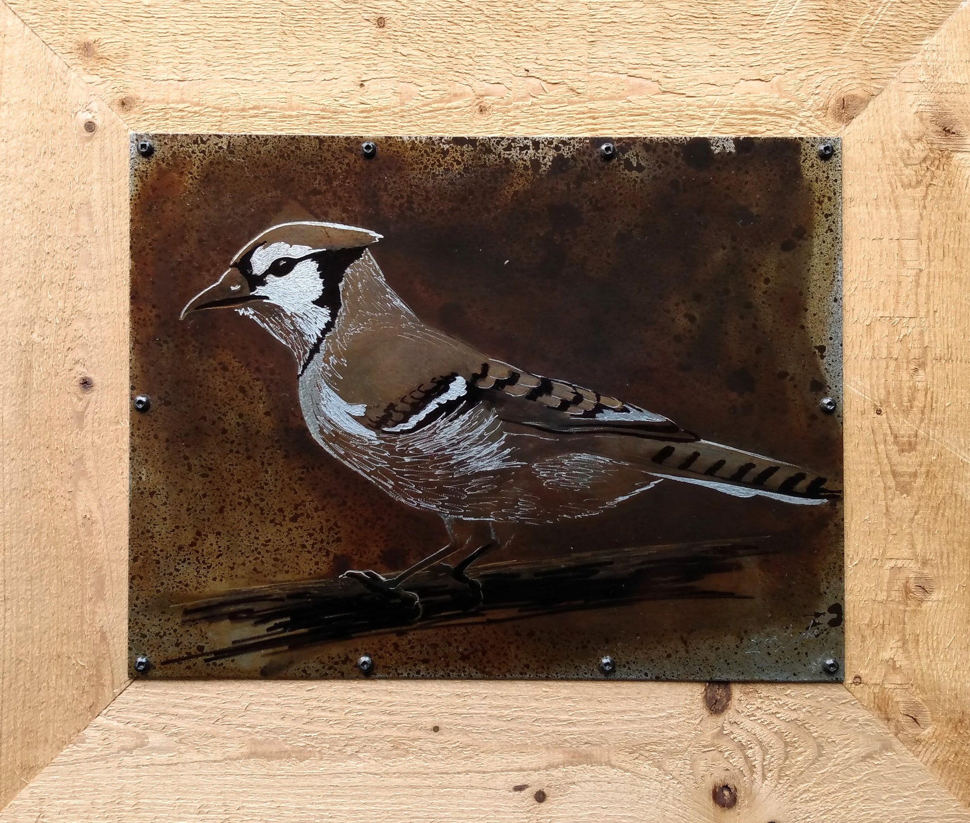 Blue Jay Study is an original Metal Drawing by artist Jen Lipski. This unique artwork was created by painting onto a sheet of steel with layers of clear acid. The acid is quickly applied to the metal, causing the steel to rapidly oxidize and darken in colour, before being washed away to control the effect. After the patina, thin surface layers of the steel are then sanded away to expose the raw metal beneath, creating remarkably bright highlights. The artwork includes a rustic frame made of reclaimed wood, secured directly to the painting. Due to the highly reflective nature of the steel, the appearance of this artwork varies greatly under different lighting conditions!