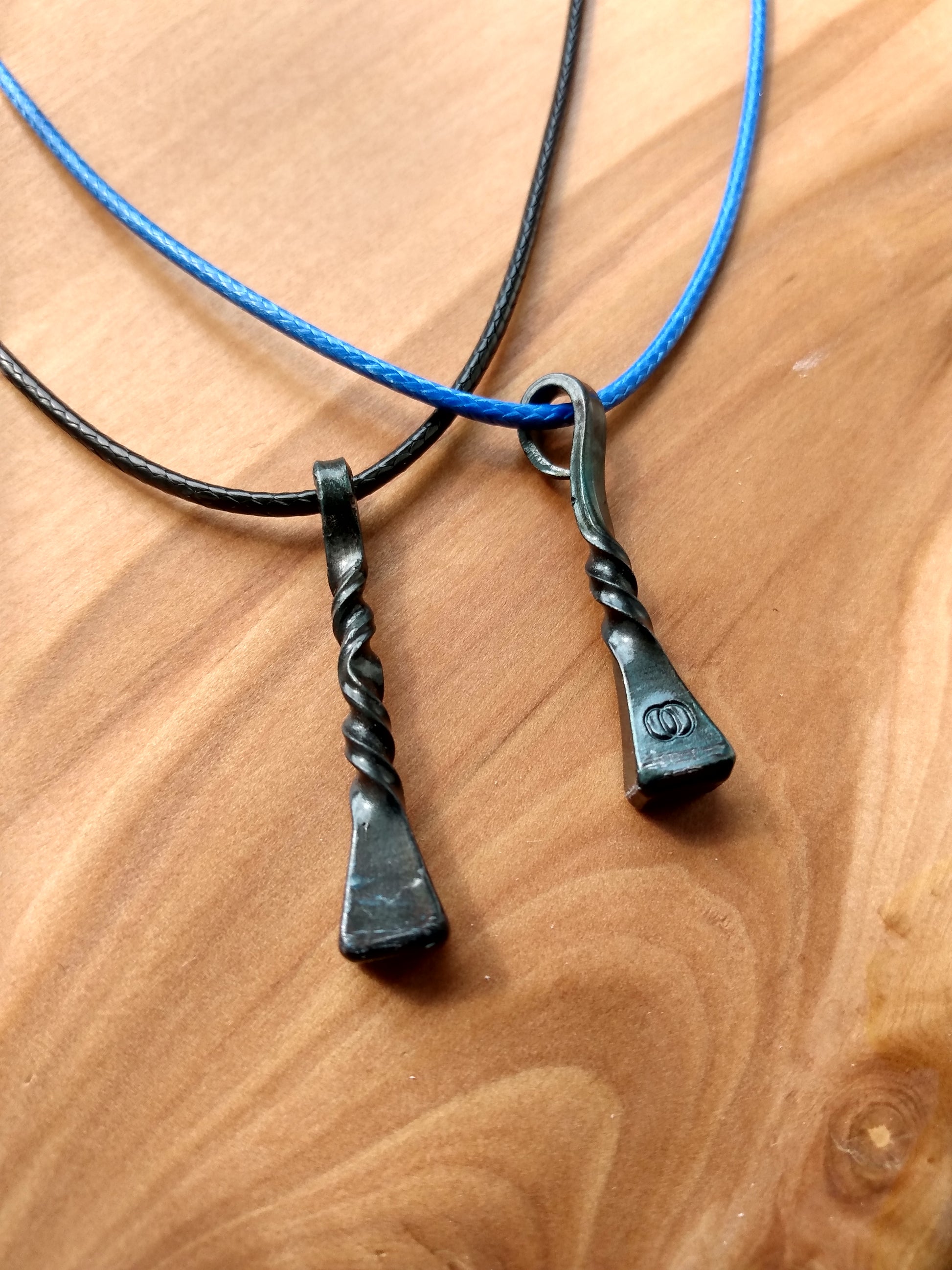 These unique iron pendants are heated up in the forge and twisted by hand using traditional blacksmithing techniques. Once cooled, the metal hardens and forever locks their delicate design in place. They are then polished and coated to resist rust and add a glossy sheen.
