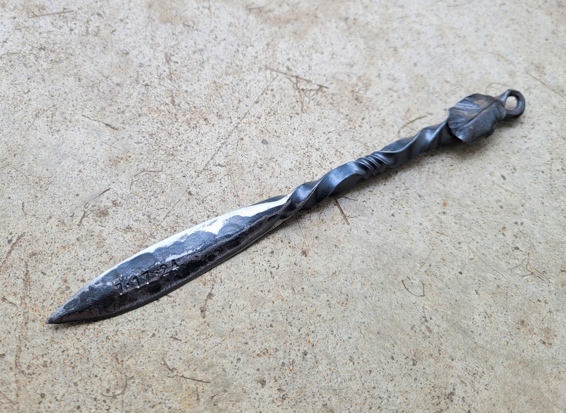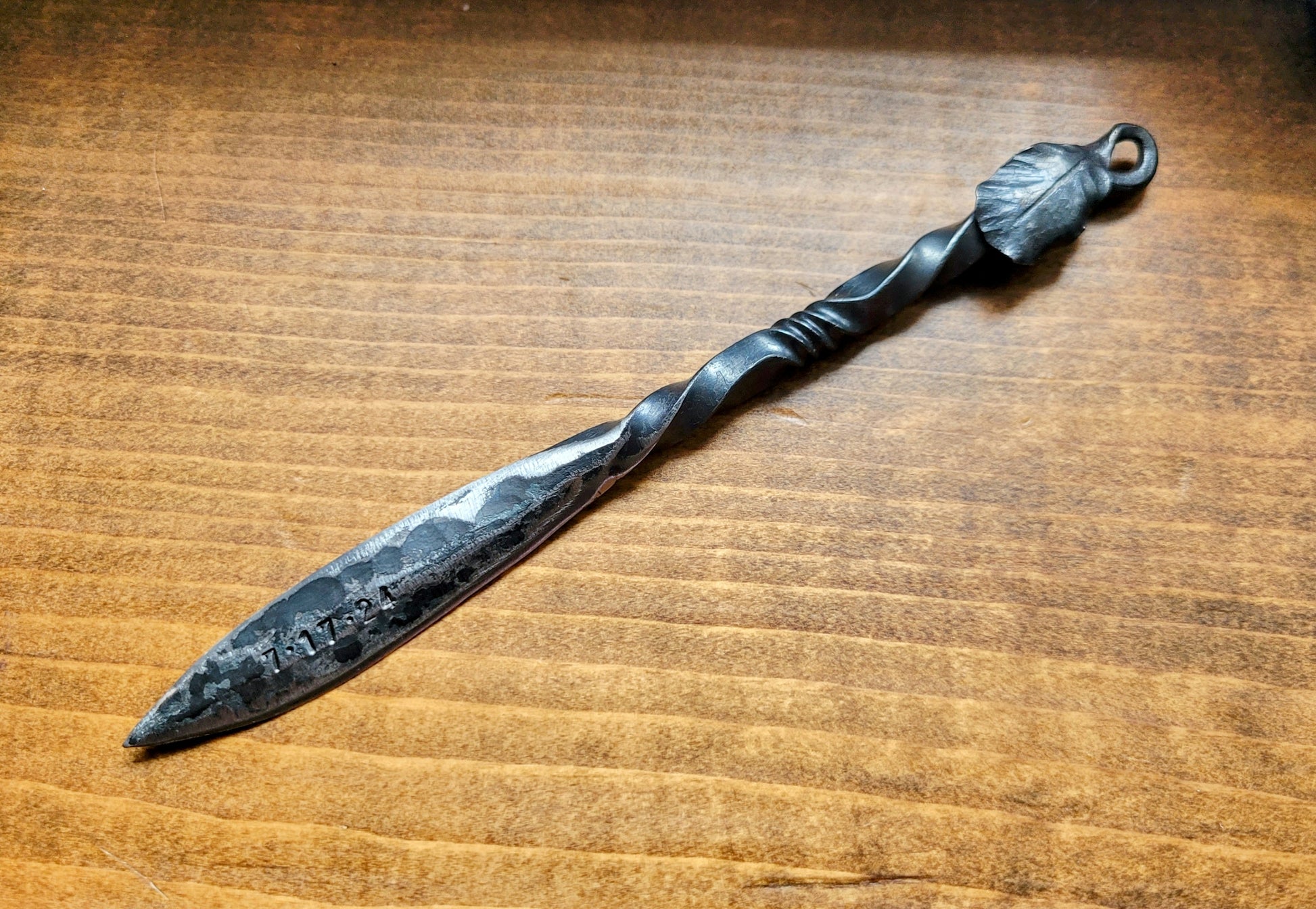 This hand-forged letter opener is custom made to order, with a Fiddle-Leaf Fig detail and personalized inscription. It measures approximately 7 inches long and includes a gift box