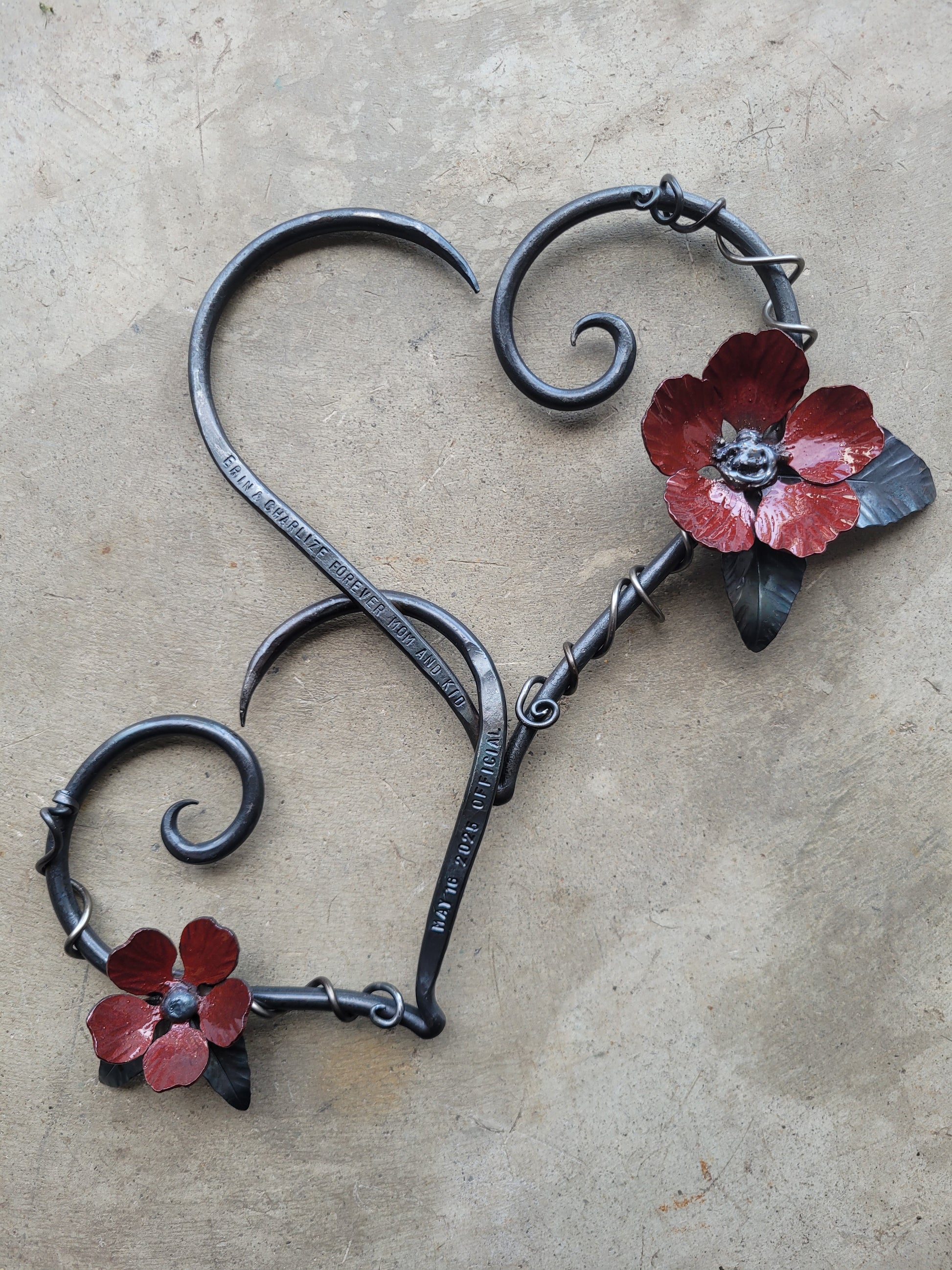 This custom set of Linked Hearts includes a larger 7" heart linked together with a 5.5" heart. Both hearts include a custom inscription in the metal and hand-forged floral details, and the set are welded together into a single design. Tracked shipping to the US is included