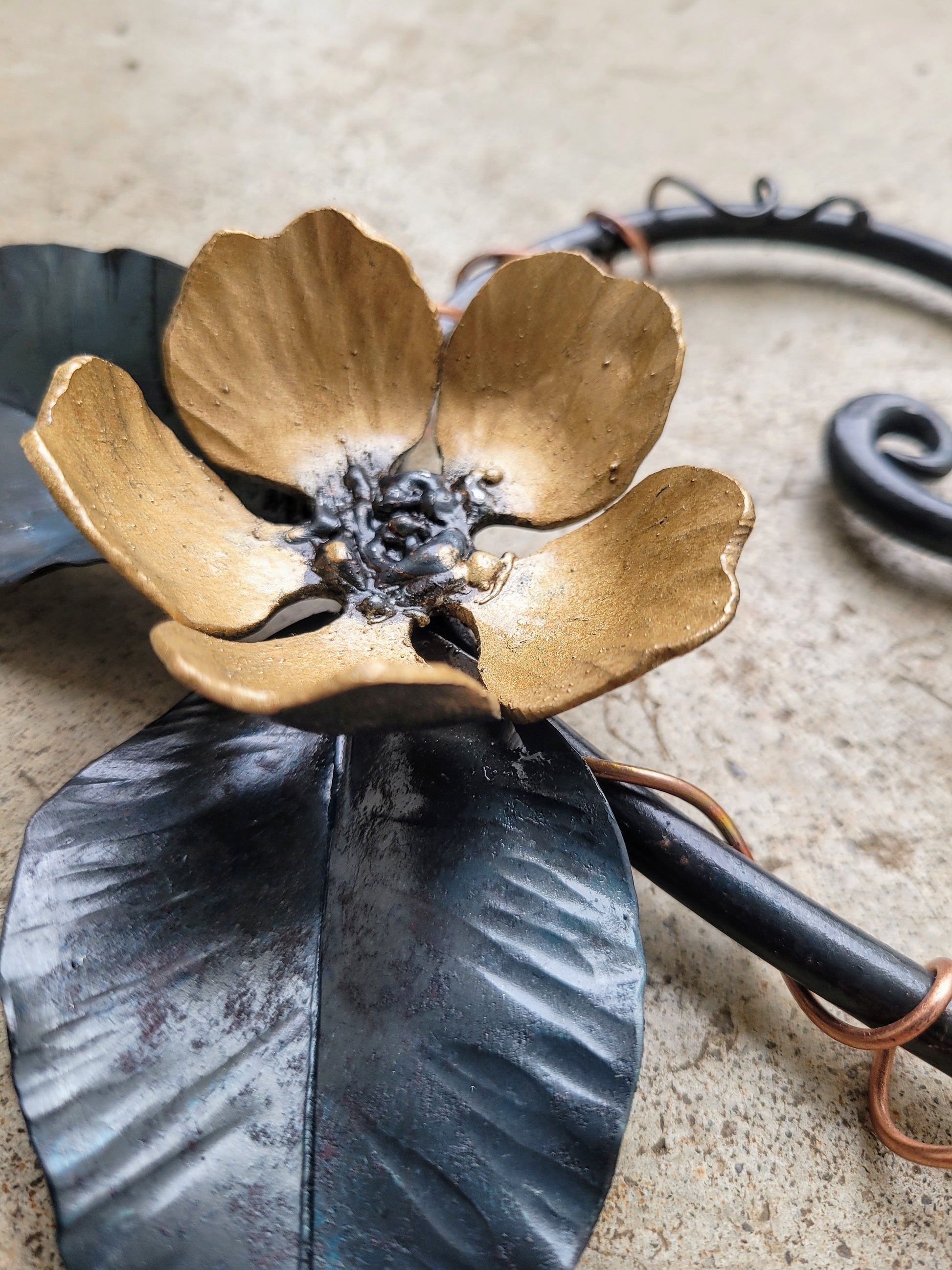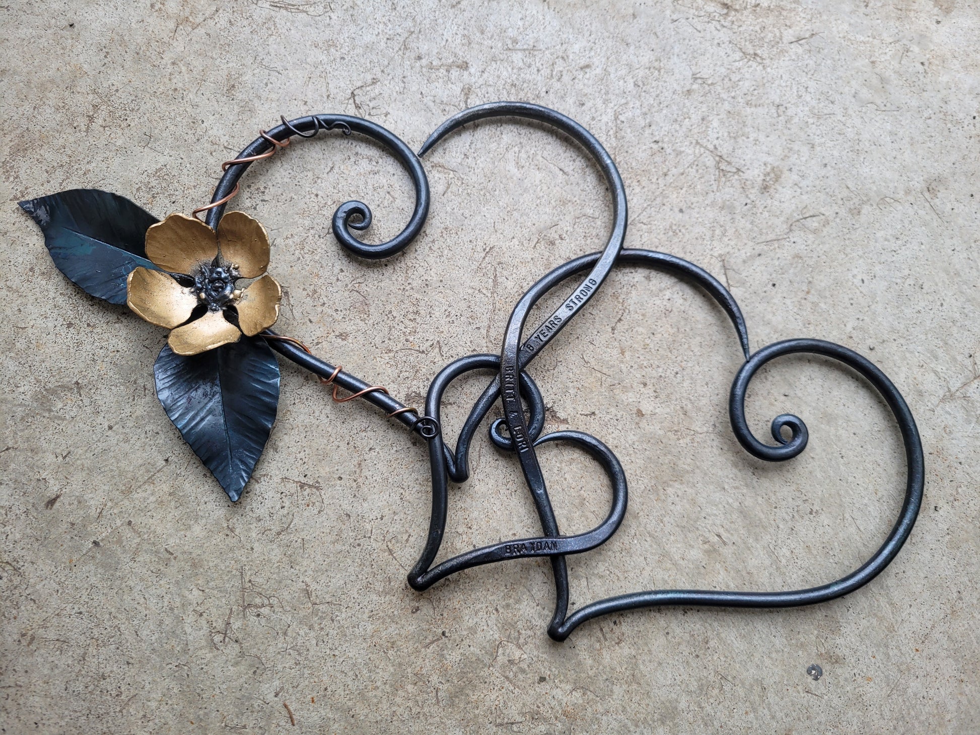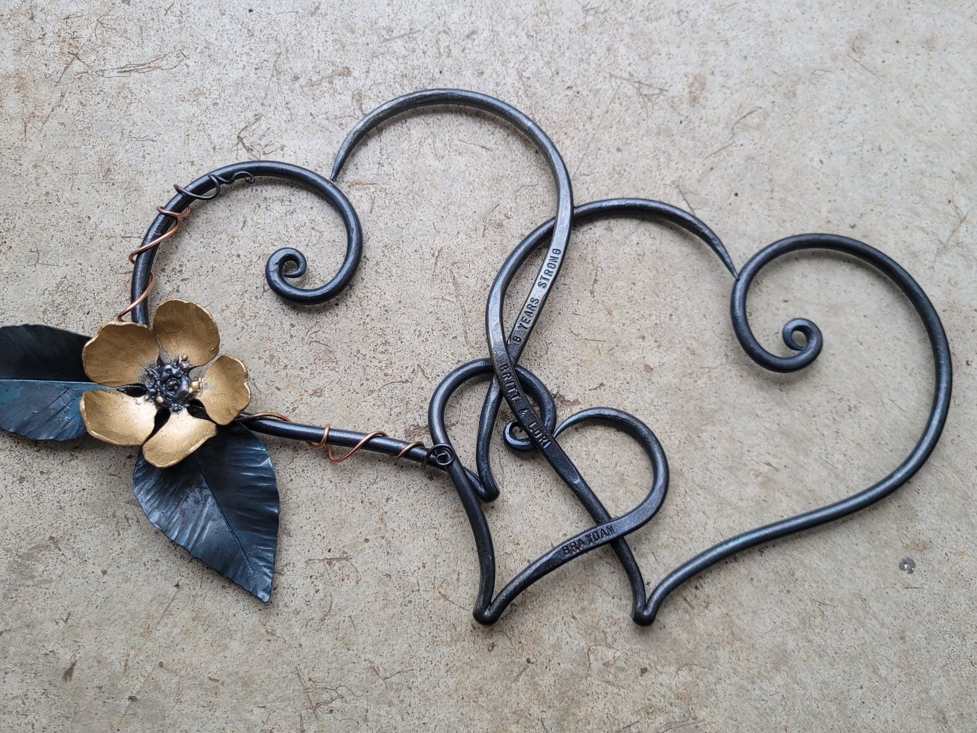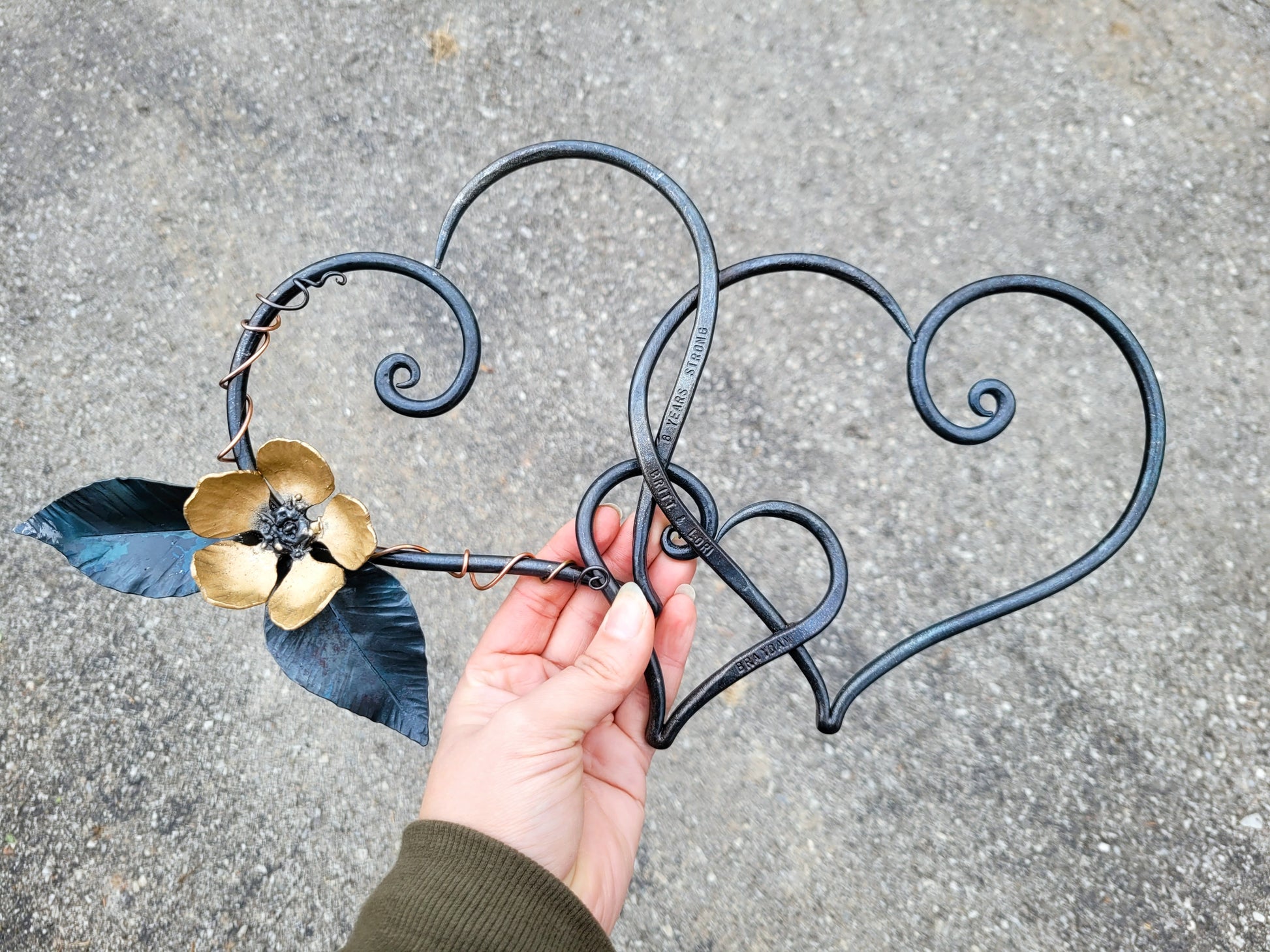 This custom forged metal wall sculpture features three large linked iron hearts with a forged flower accent and custom inscription in the metal. The natural color of the metal is accented by a gold finish on the flower petals. This artwork includes two screw holes integrated into the design and black screws for installation
