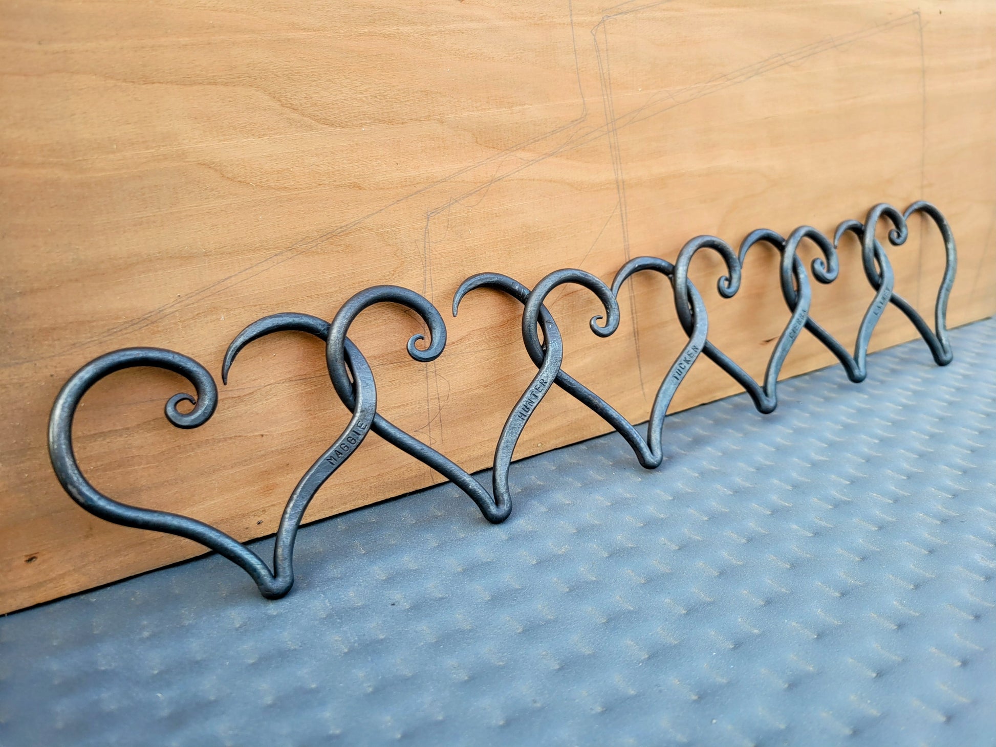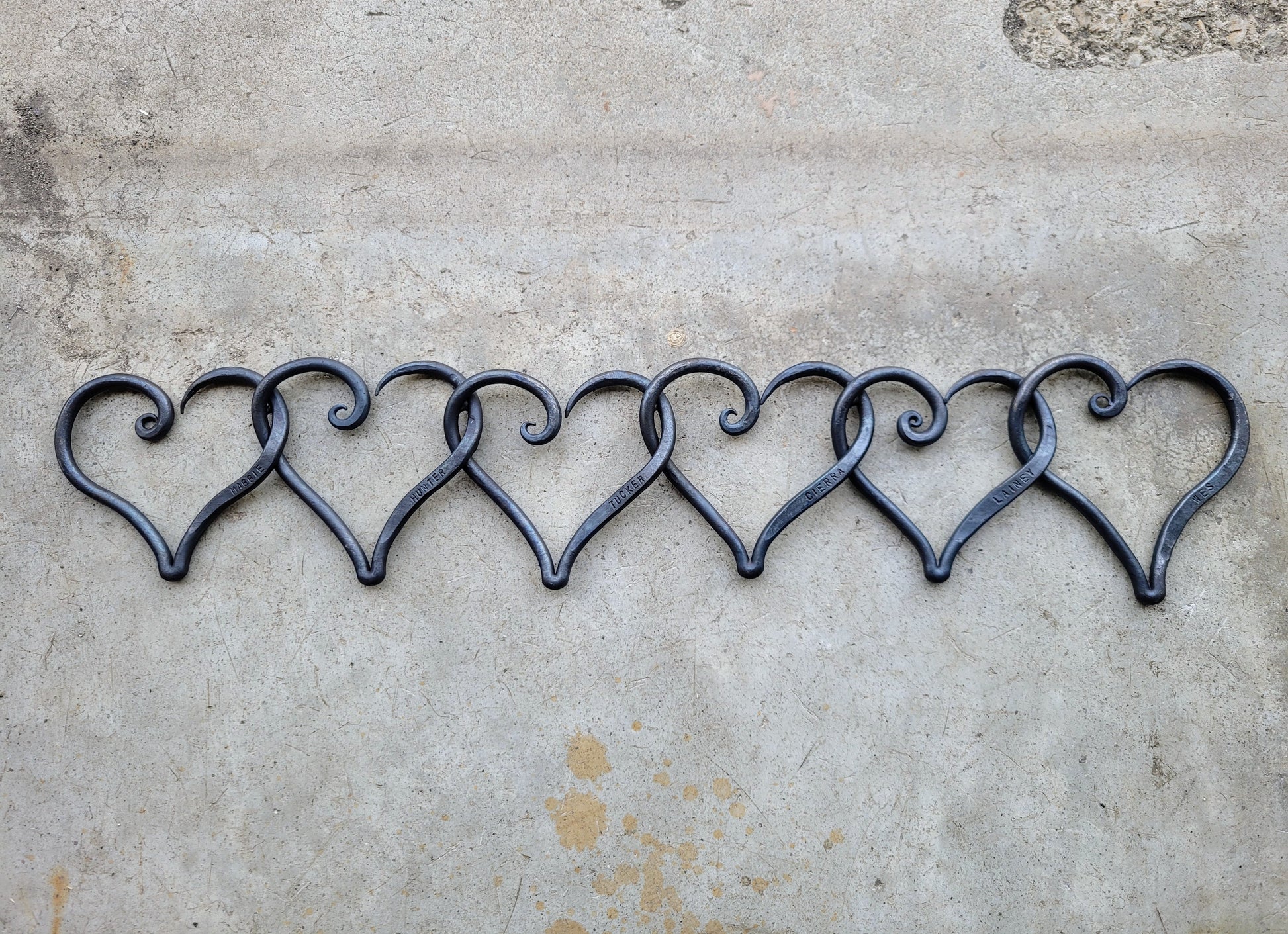 Based on our traditional linked hearts, this set of 6 hearts are linked side-by-side and welded together into a single ornament. Each heart includes a custom inscription in the metal to represent the whole family. Screws are provided for installation and tracked shipping premium is included in purchase