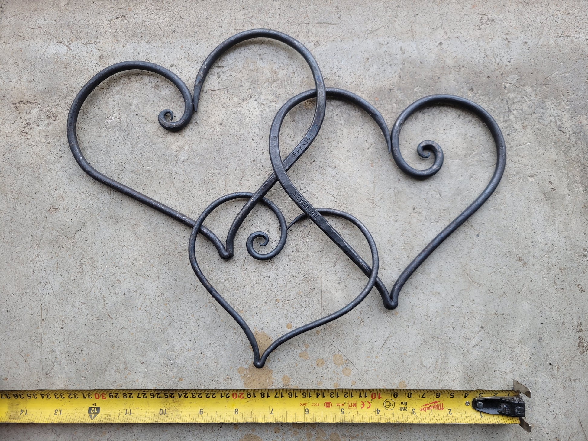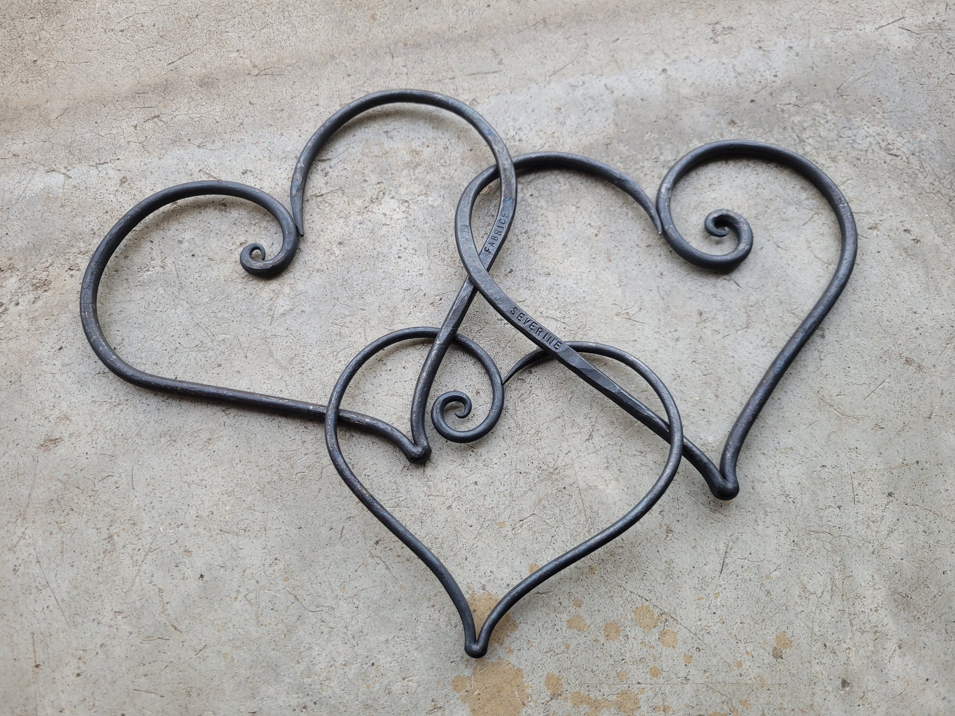 This custom set of hand-forged iron hearts includes a personalized inscription in the metal and tracked shipping premium. Based on our original Linked Hearts, the two larger hearts in this set measure approximately 18-20 cm in width and the smaller heart measures approximately 15 cm