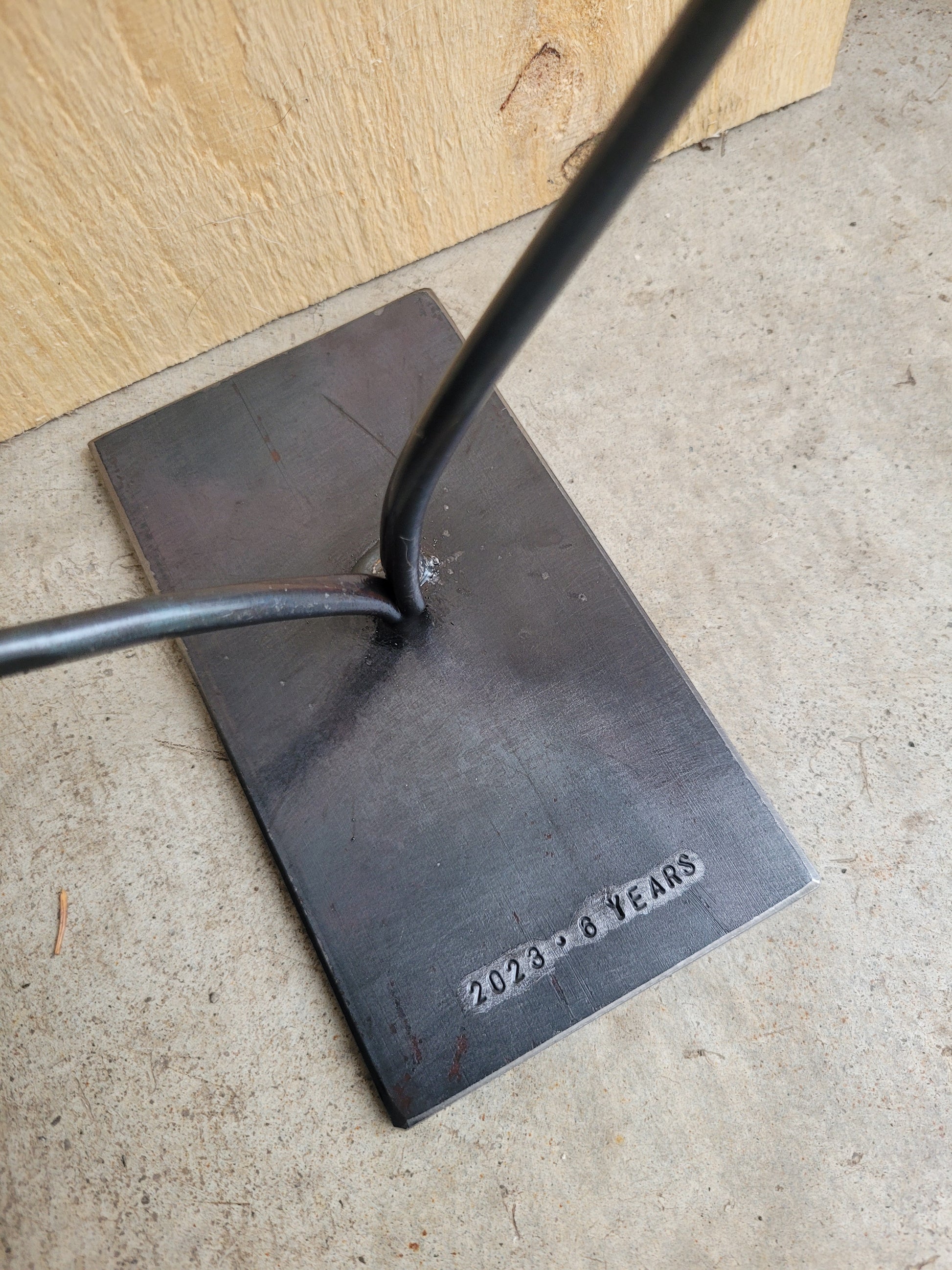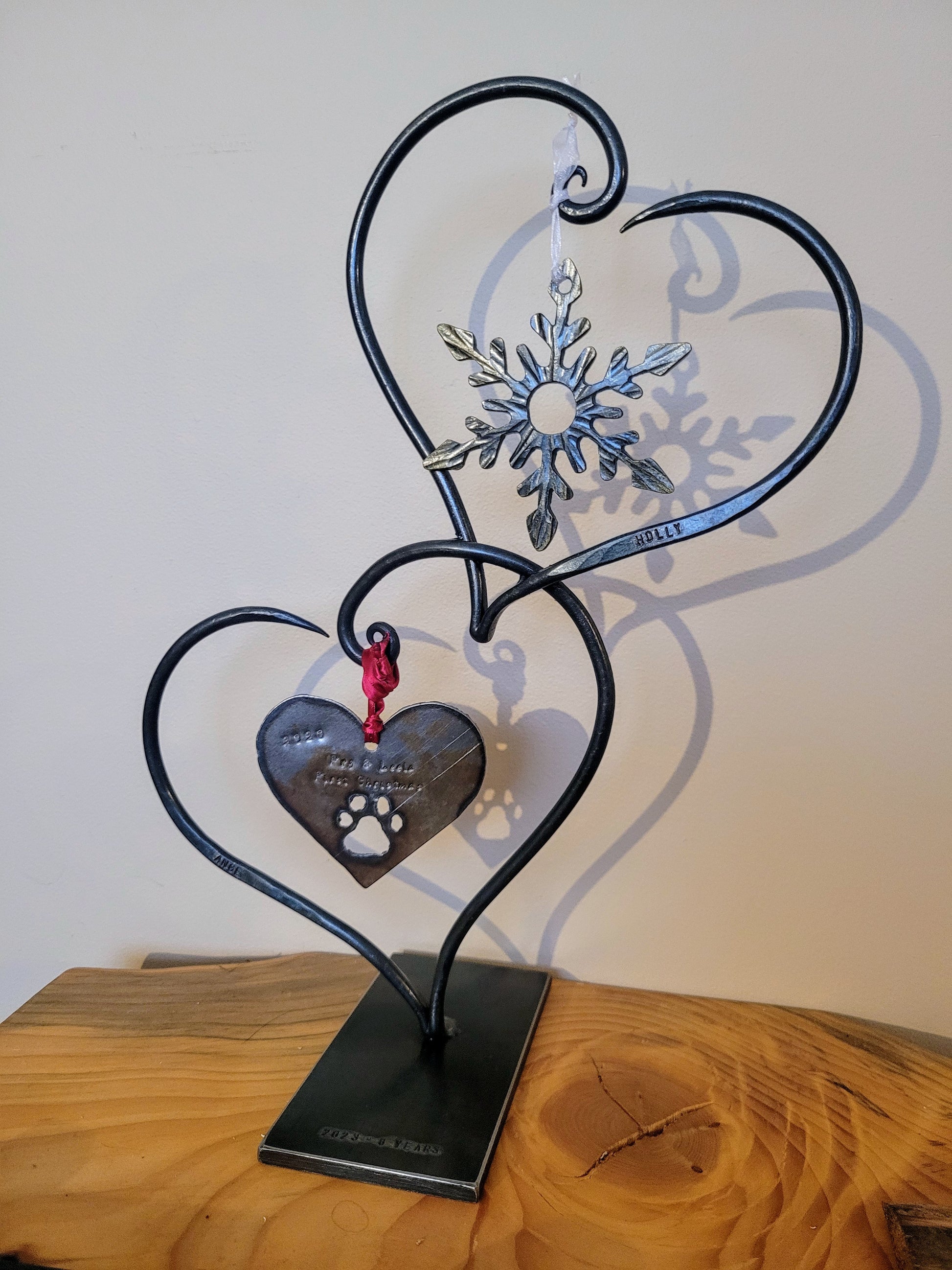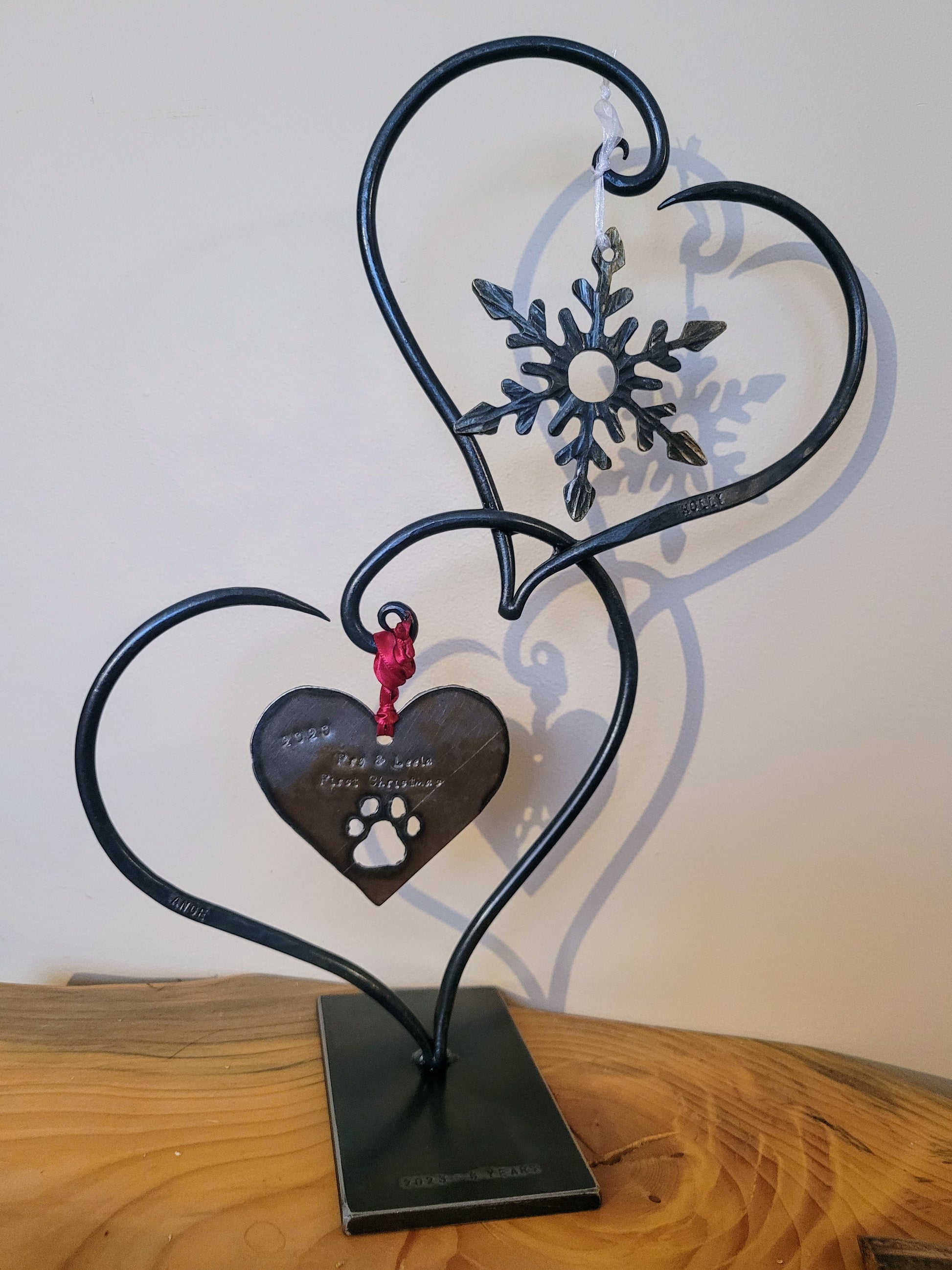 This custom hand-forged ornament stand features two large linked hearts with a deep steel base and custom inscription in the metal