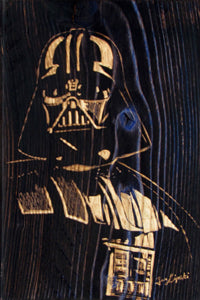 This unique painting is burned and carved into wood, inspired by Darth Vader. Also check out our Boba Fett portrait!