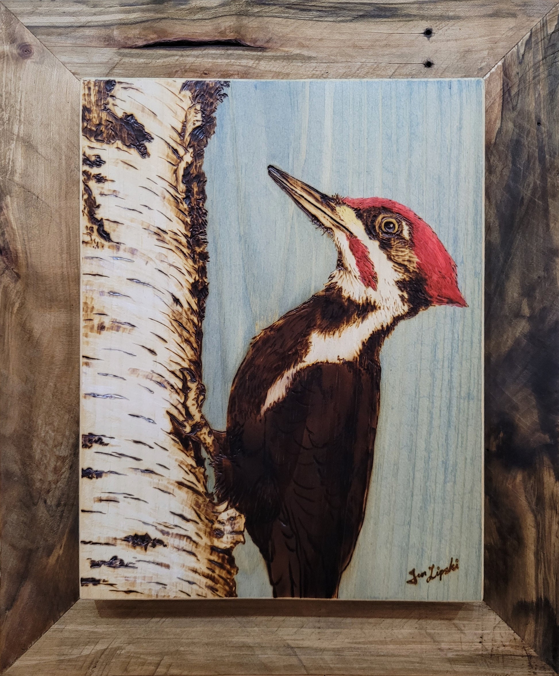 Day's End was a last minute addition to a small series of carvings made during an art retreat in Buckhorn Ontario in October 2021. After each day's work I would finish off my evening with a relaxing canoe trip to watch the sun set over the bay. On one particular night just as I was about to turn and head home, I found myself drawn into shore by a loud and unusual noise. Through the fading light and thick brush, I discovered this large pileated woodpecker pecking into a damp and dead birch stump. Unbothered by my presence, I sat and watched this beautiful creature until the last of the day's light was gone. Upon returning to the cottage, I immediately pulled out a spare piece of wood and began drawing.