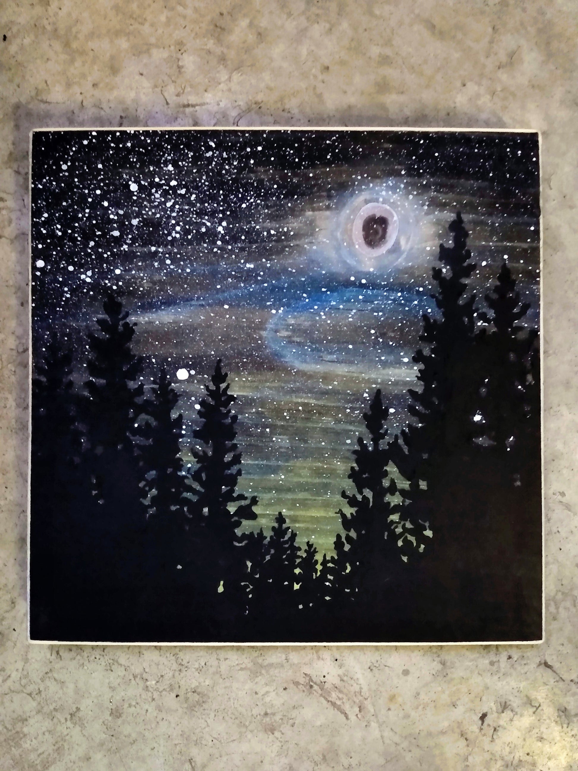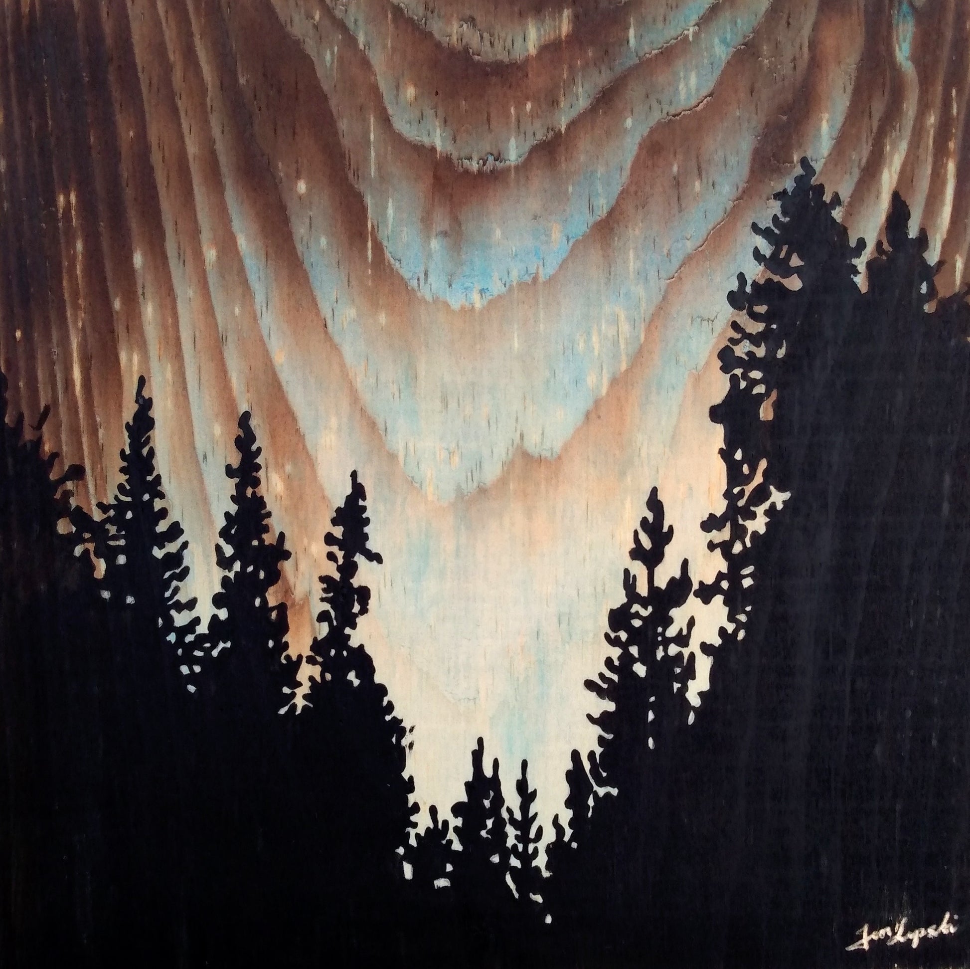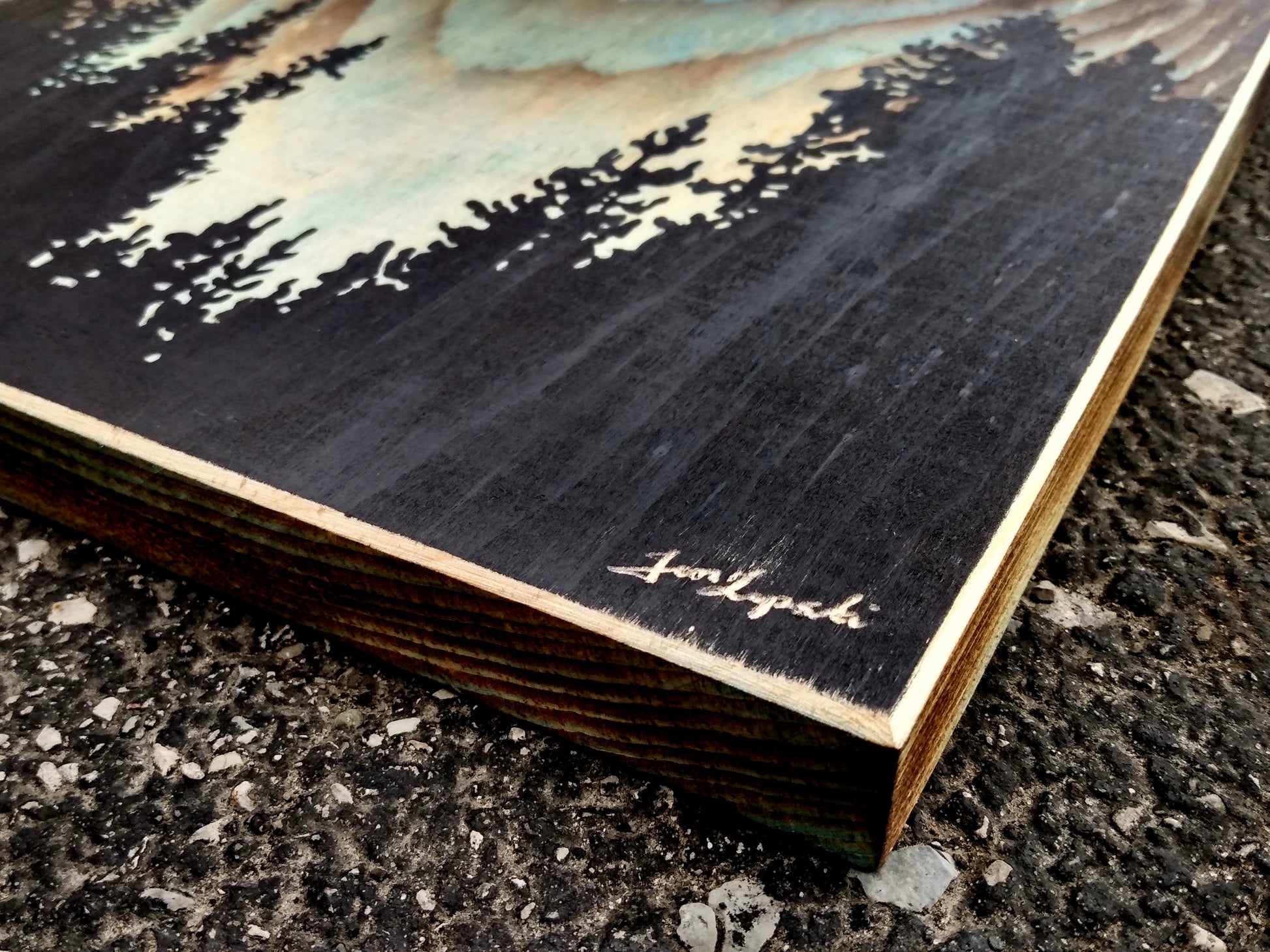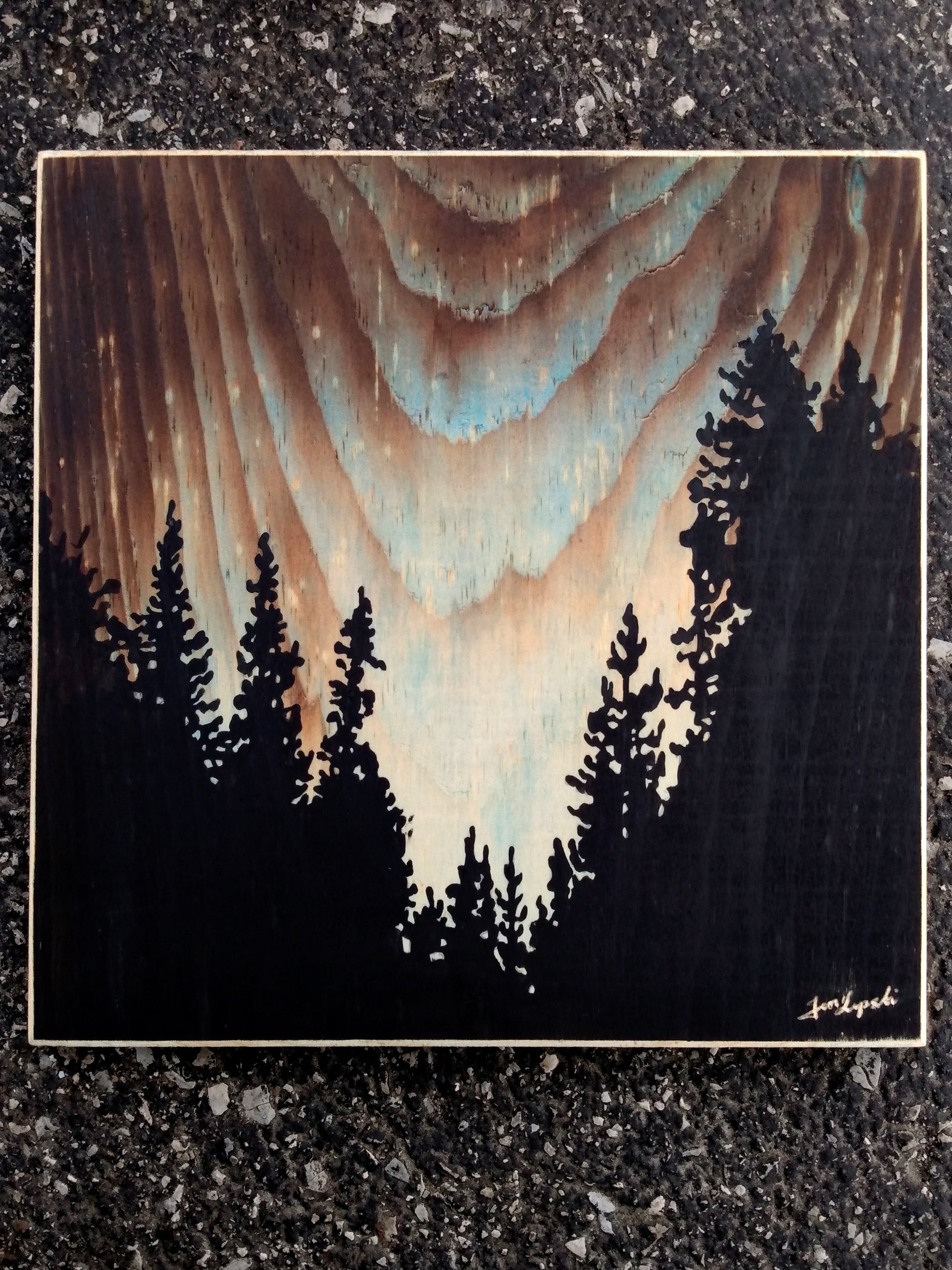 This original painting is burned, stained, and then finally painted onto a plank of unfinished wood. The artwork measures approximately 9 x 9 inches and includes hanging hardware. The colour wraps around the sides of the wood, and the painting is beveled and highlighted at the edges. No frame necessary, simply hang from a hook or nail on your wall!