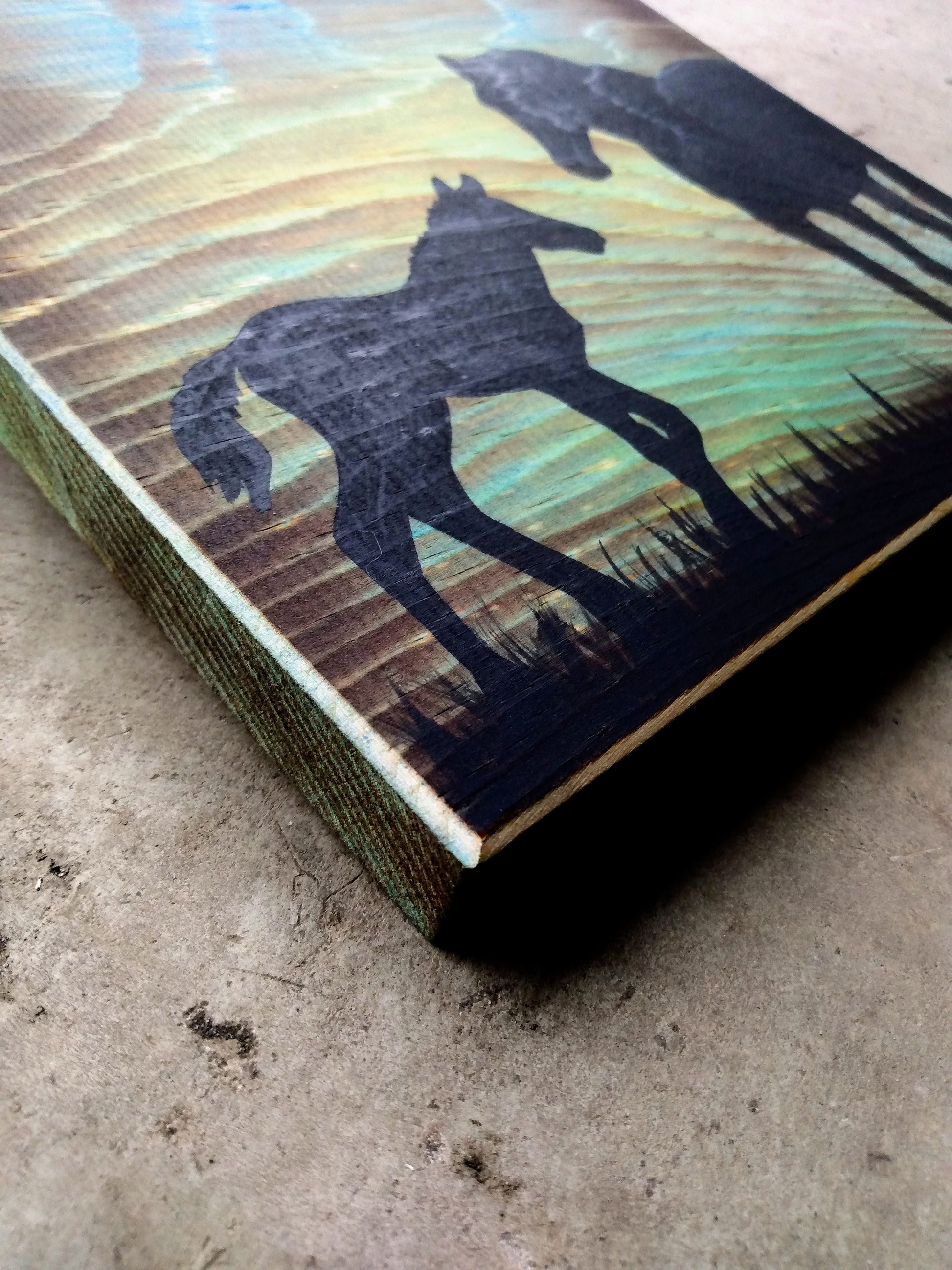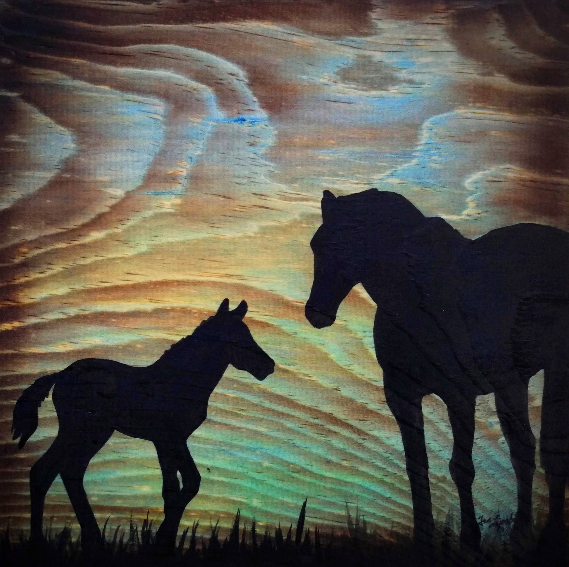 Learn the ropes with this loving dam and her foal in this one-of-a-kind horse themed silhouette painting. Painted on natural wood, this beautiful horse painting would make a wonderful accent piece for your home, farm, or cottage.