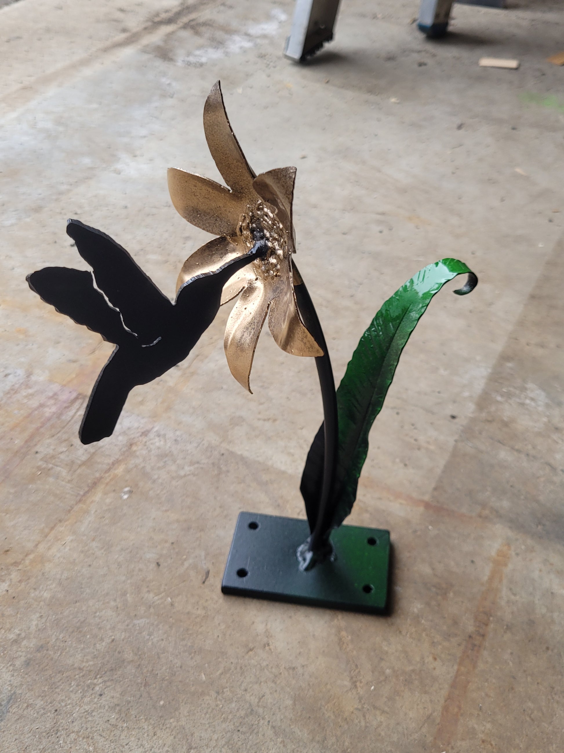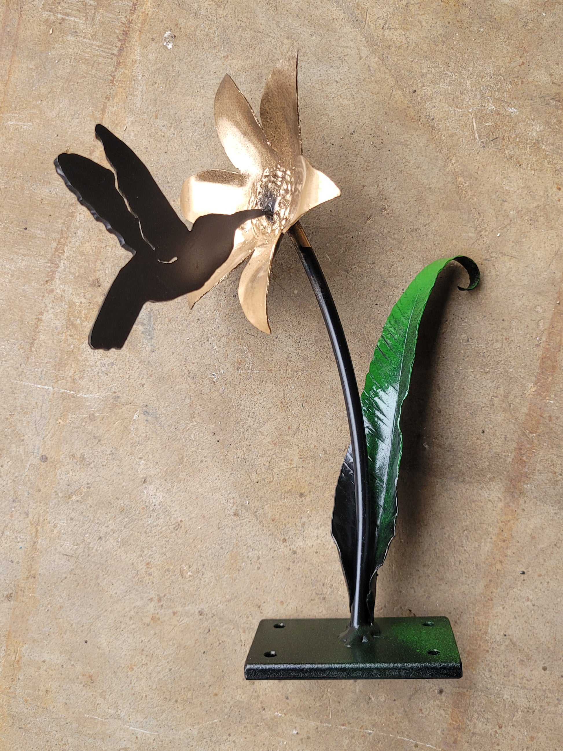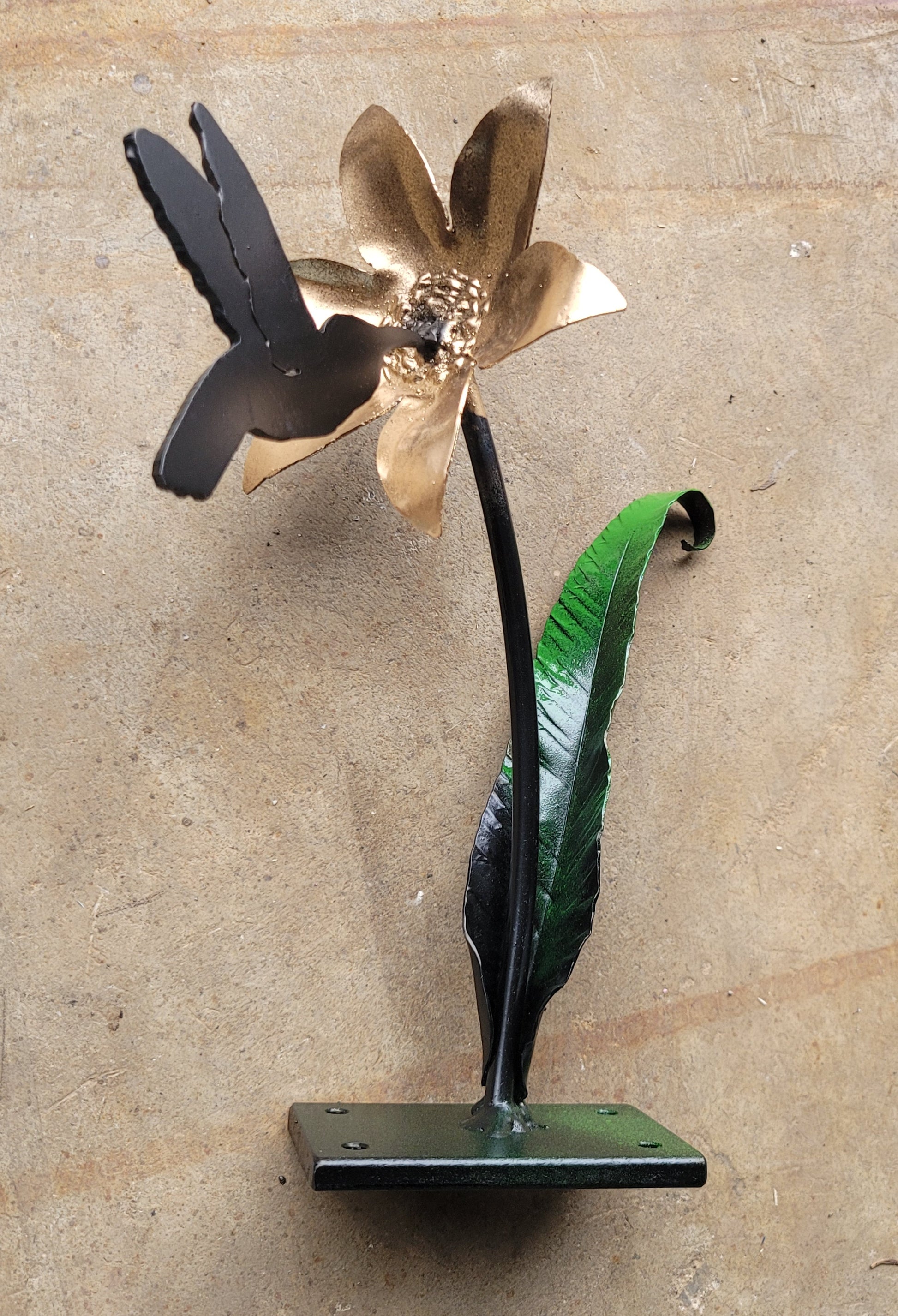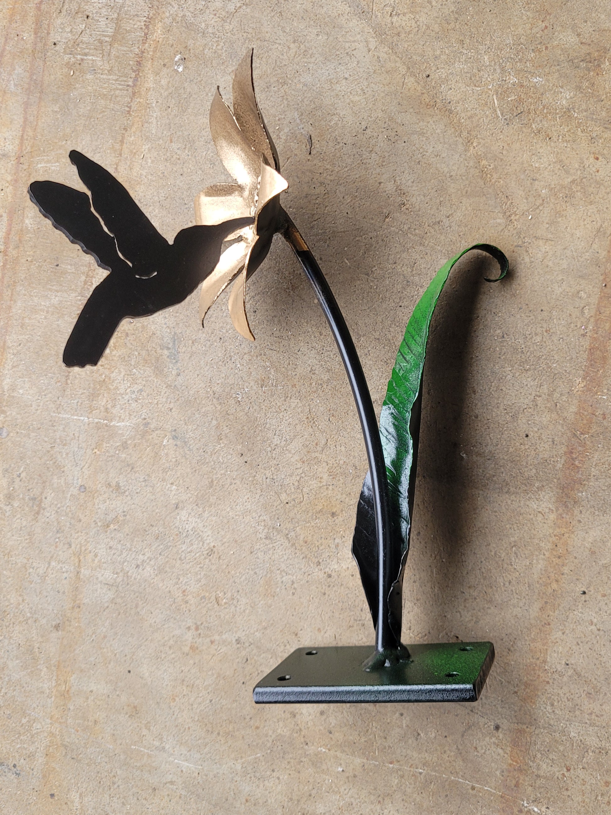 This metal hummingbird garden sculpture is hand-cut from steel plate and designed for indoor or outdoor display. It features a hummingbird silhouette and hand-forged flower with welded and painted accents. This sculpture measures approximately 9" tall and the welded steel baseplate features holes to fasten the sculpture to a railing, table, or ledge. Black screws are included for mounting