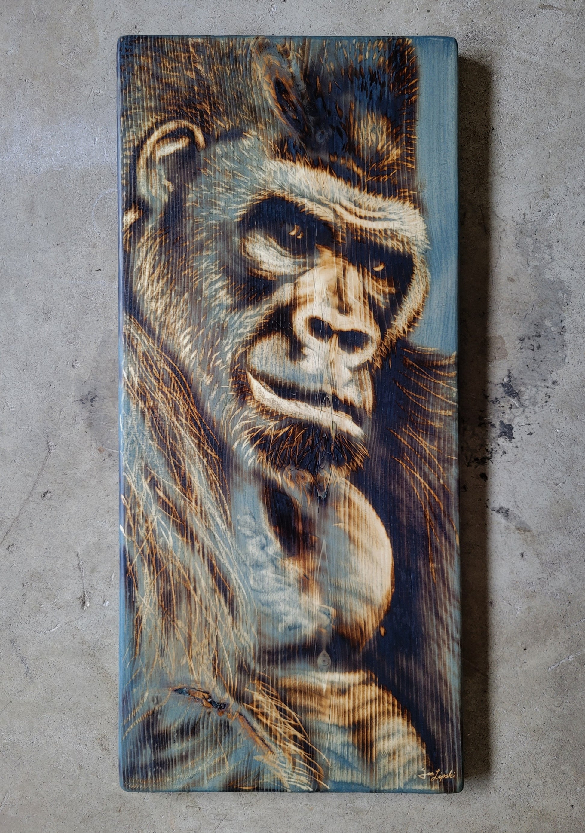 Less Than Us is a burned and carved gorilla portrait by Canadian Artist Jen Lipski completed in 2022. The title refers to the "Us vs Them" mentality which humans use to value and elevate themselves above all others. Whether that line is drawn at race, religion, gender, species, or geographical location, we will never see equality for as long as we systematically believe that They are less than Us