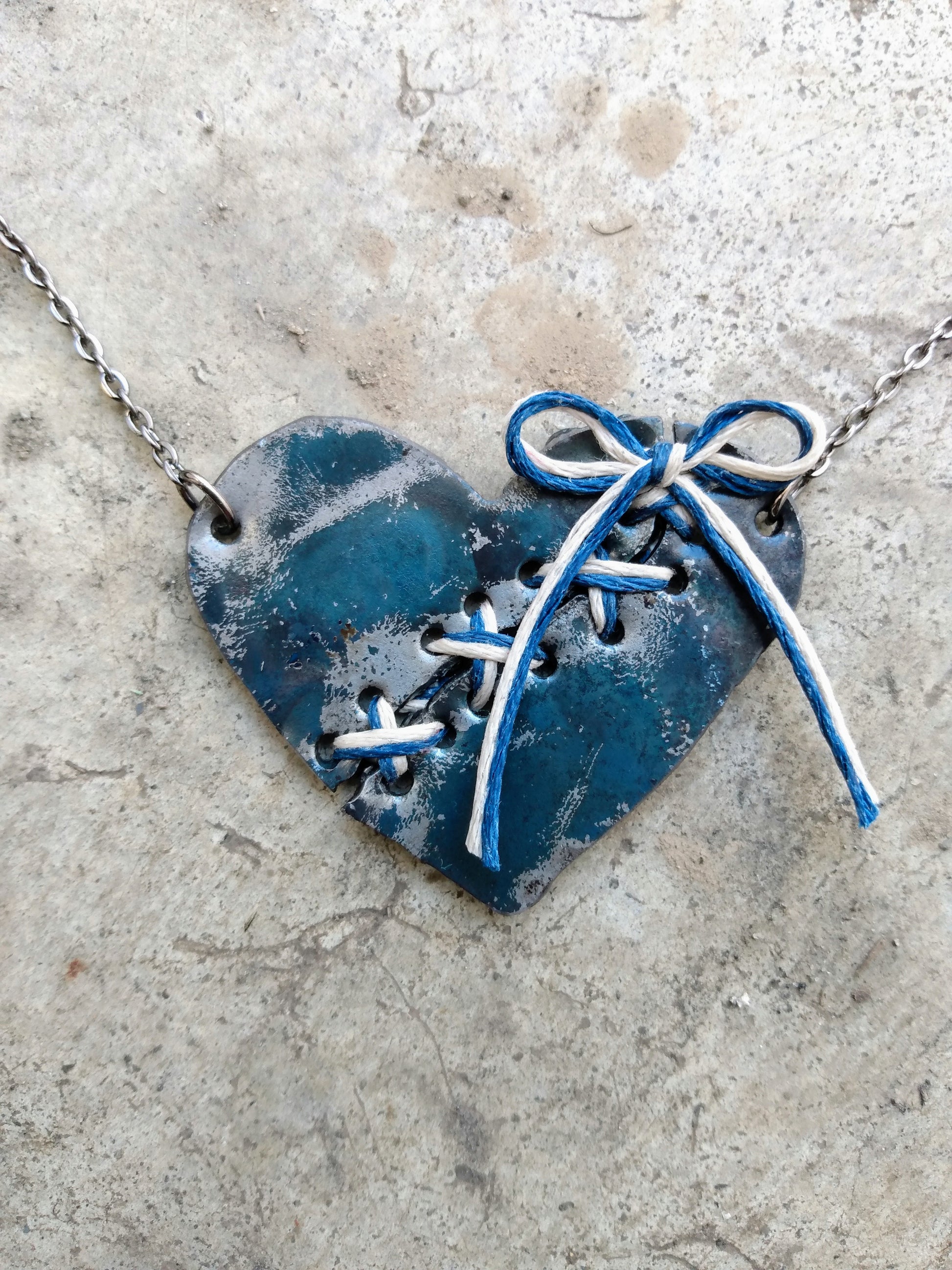 No two pendants are alike! Each heart is crafted from a specially selected piece of reclaimed/scrap metal, which is plasma-cut by hand in two separate pieces and then stitched back together to form the final pendant. Each piece of metal is carefully selected for its unique characteristics, giving each heart its own charming rustic quality