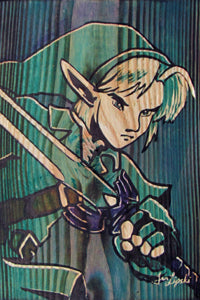 This unique painting is burned and carved into wood, inspired by Link from the video game franchise The Legend of Zelda