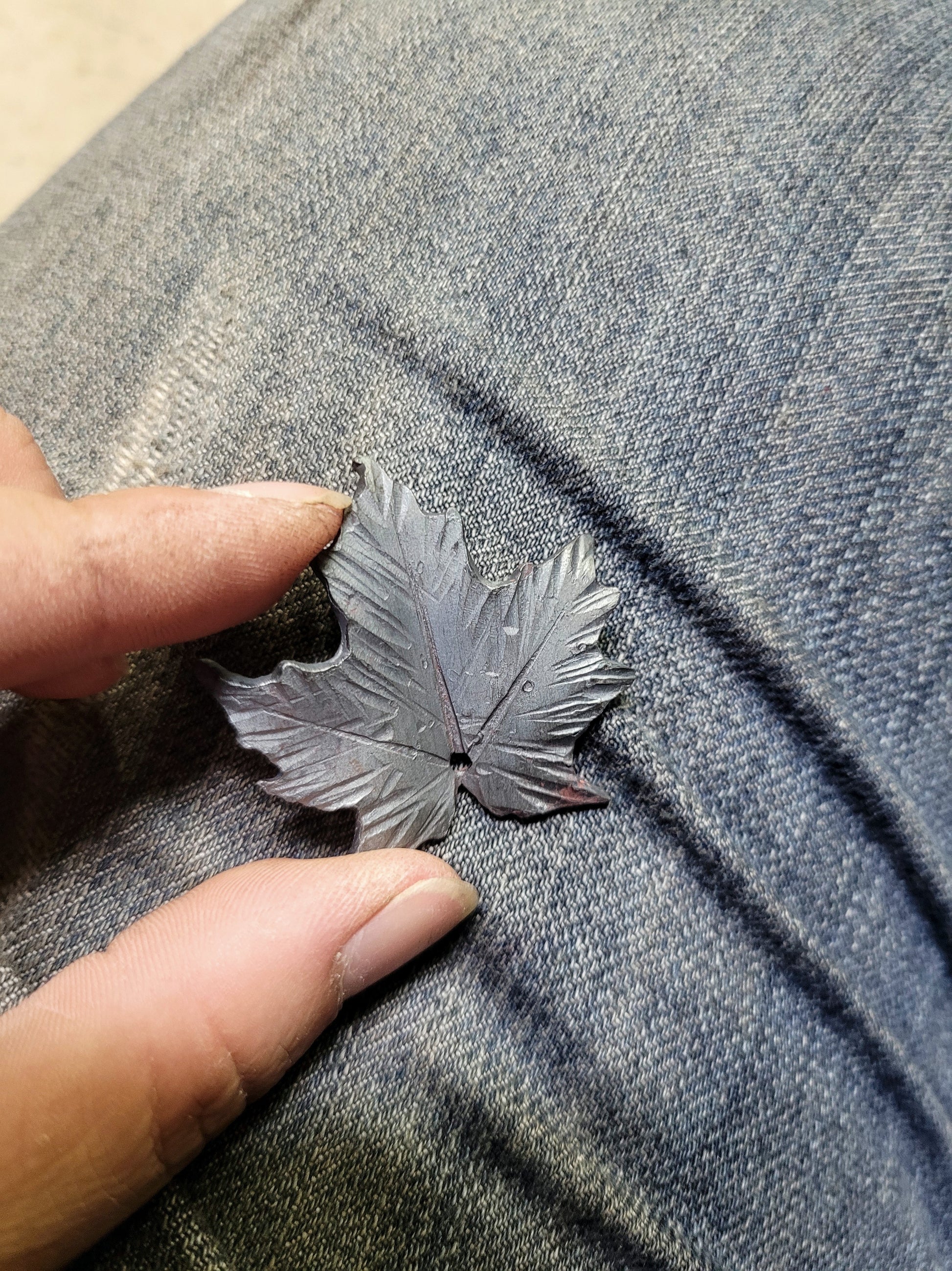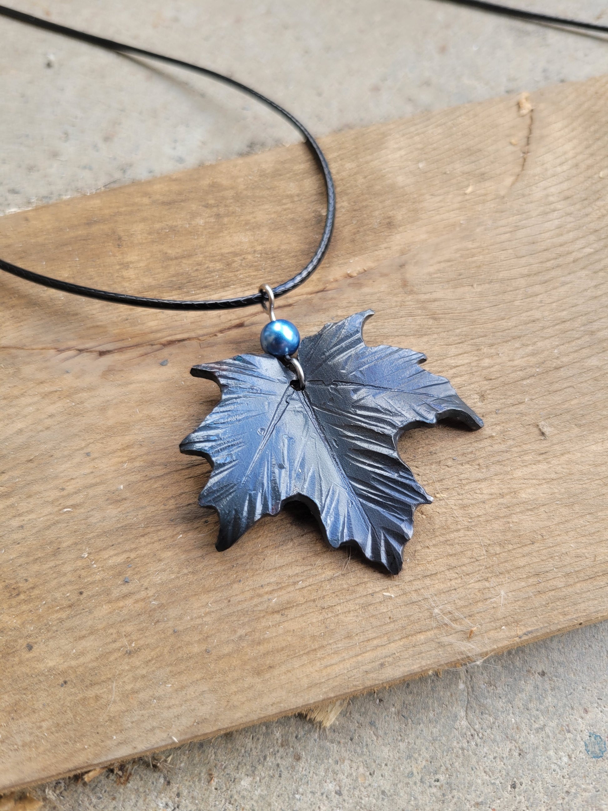 Showcasing the artist's authentic attention to detail, the exact shape of this pendant is modeled after a real maple leaf from our property. Every vein and detail in the leaf is carefully crafted by a blow of the hammer, bringing the pendant to life one stroke at a time