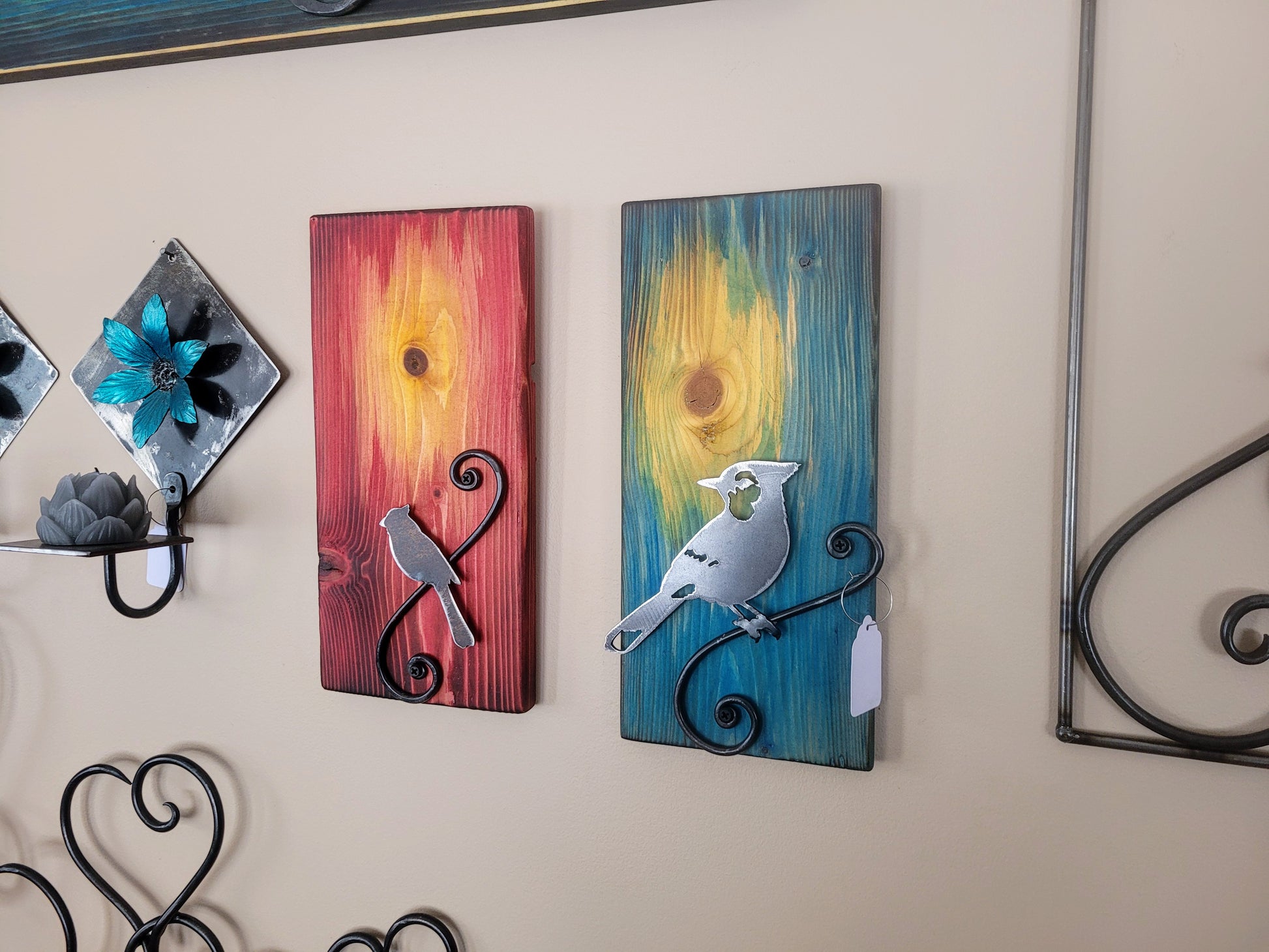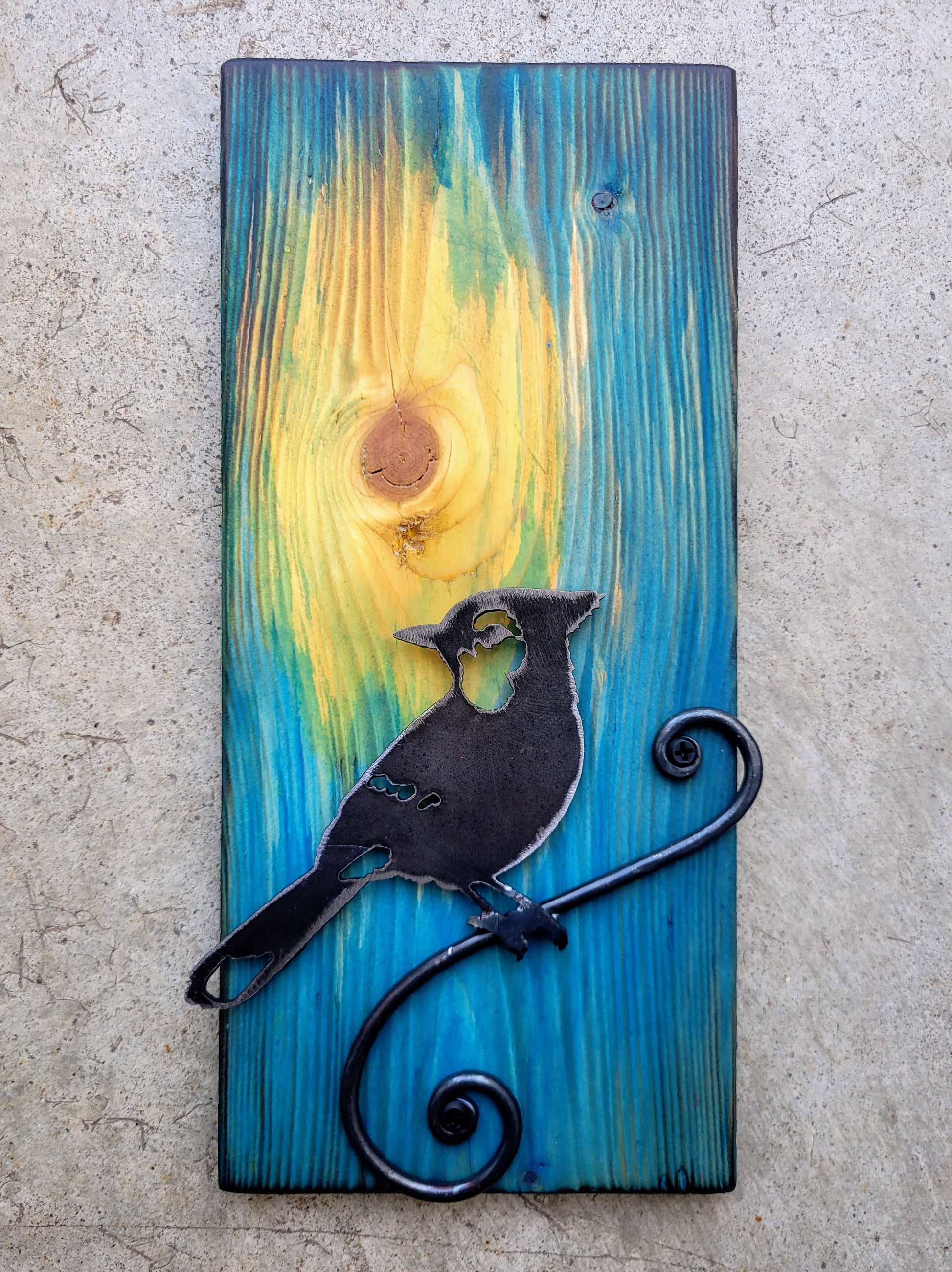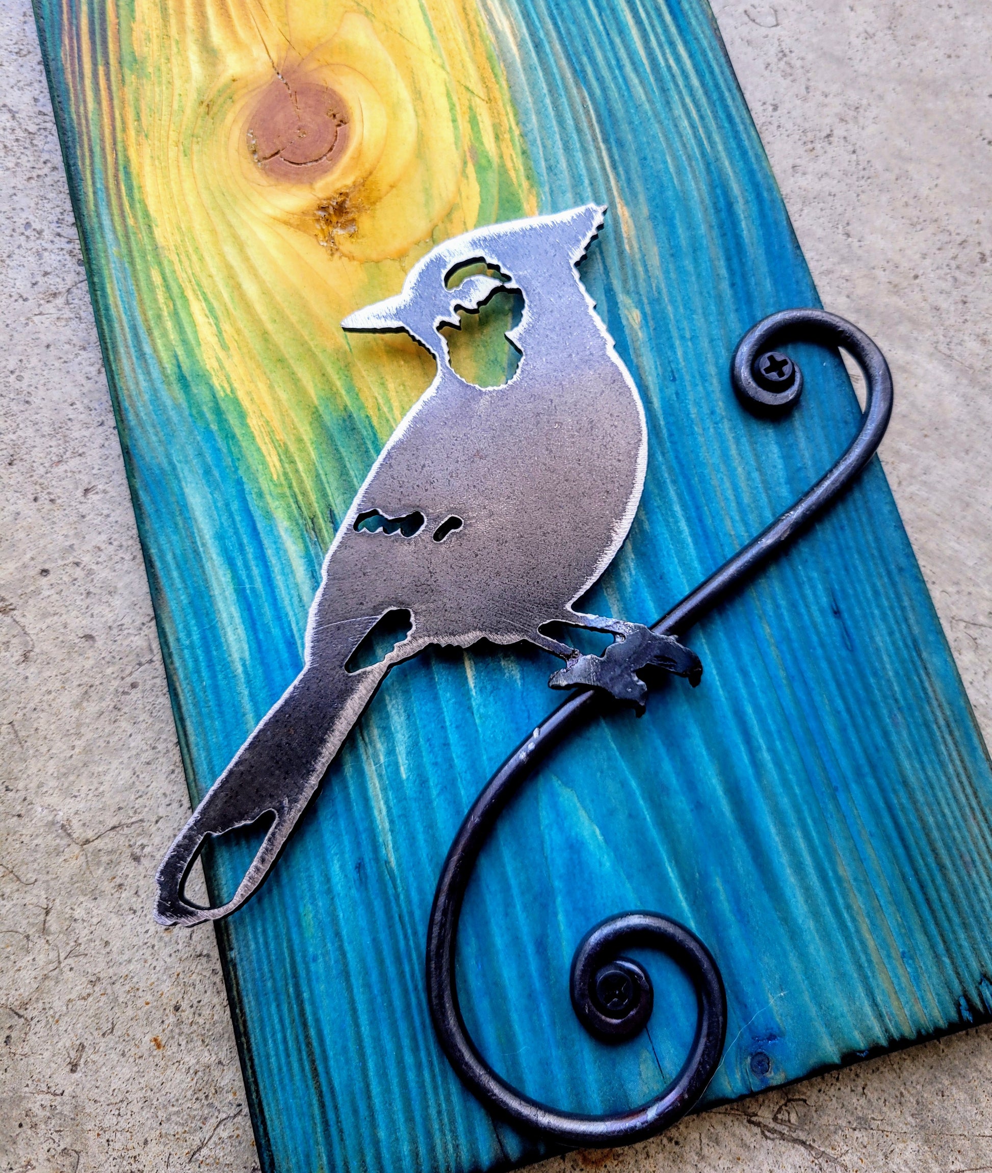 This original artwork features a burned and stained wood background underneath a forged and plasma-cut steel bluejay. The artwork measures approximately 5 x 11 inches and is ready to hang on your wall with a sawtooth-style picture hanger installed on the back. The colour wraps around the sides of the wood and so no frame is necessary, simply hang from a hook or nail on your wall!