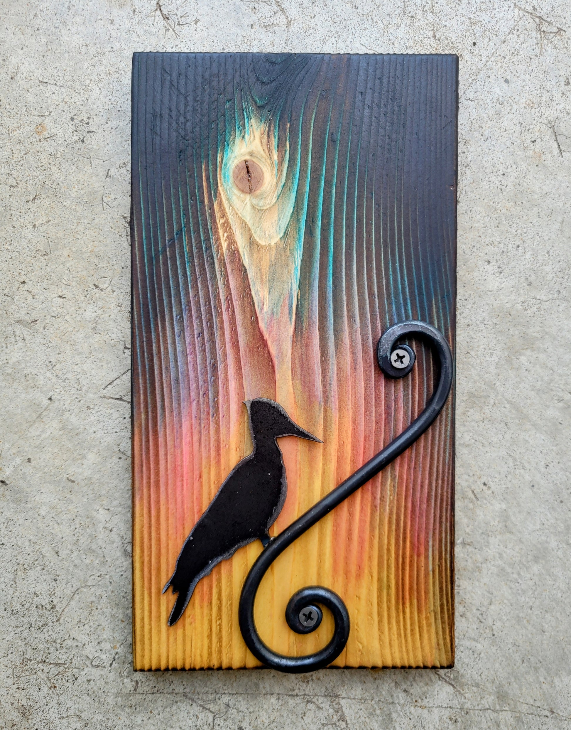 The handcrafted artwork features a burned and stained wood background beneath a forged and plasma-cut metal woodpecker silhouette. The artwork measures approximately 5 x 10 inches and is ready to hang on your wall with a sawtooth-style picture hanger installed on the back. The colour wraps around the sides of the wood and so no frame is necessary, ready to hang from a hook or nail on your wall!