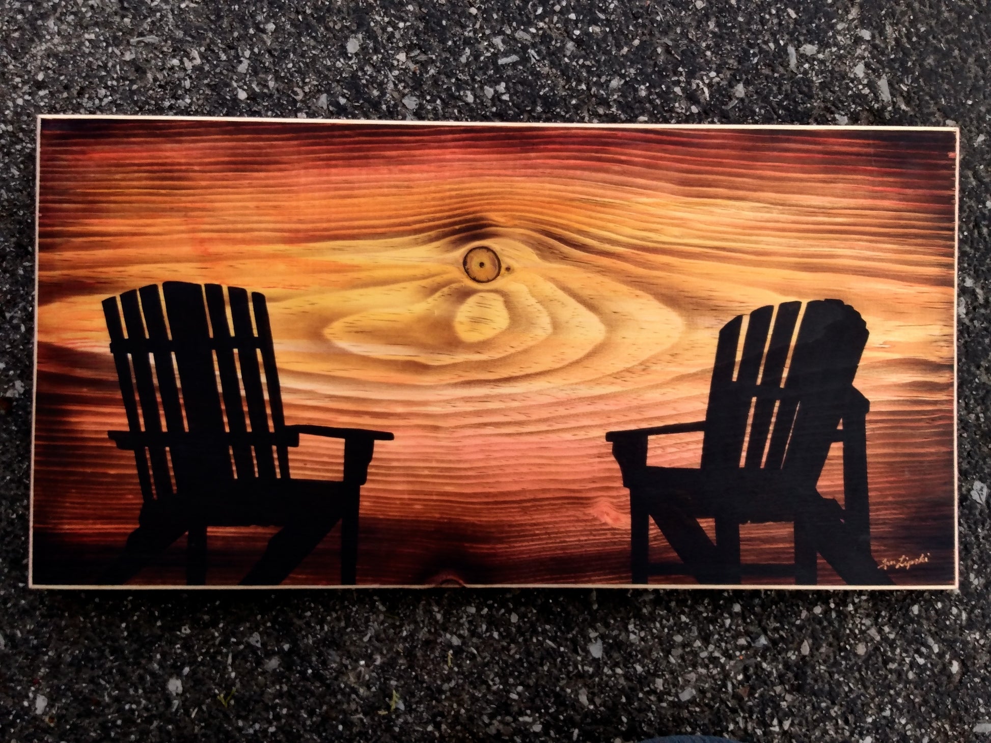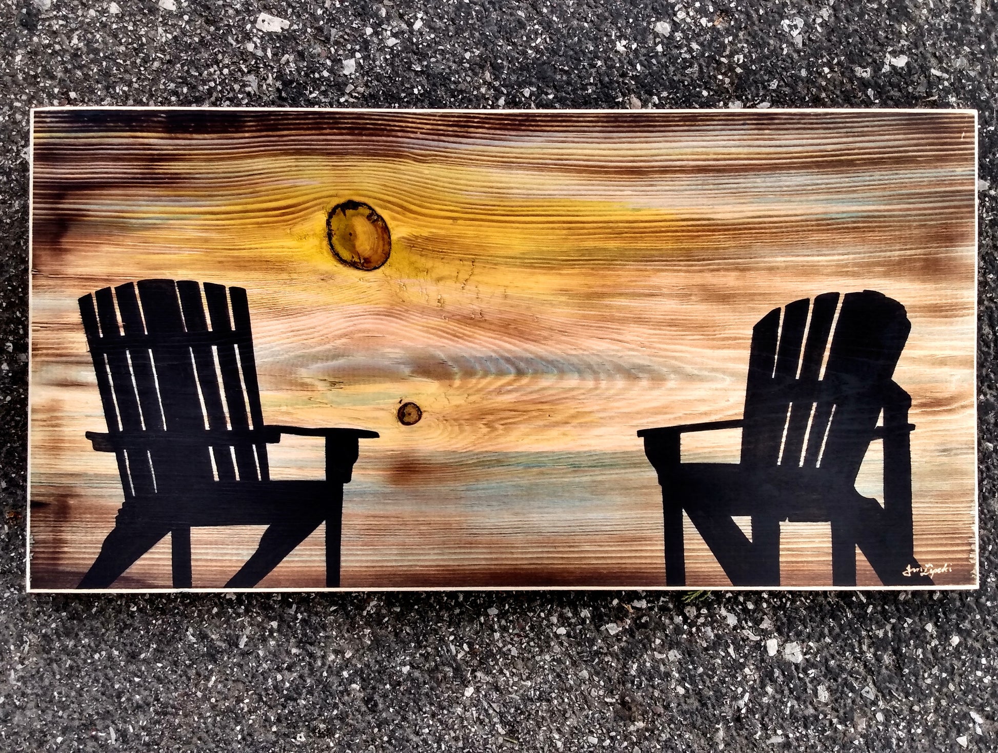 There's nothing better than sitting out by the lake enjoying the beauty of the natural world! Keep this feeling forever when you decorate your home or cottage with a relaxing waterfront landscape artwork, featuring Muskoka chairs (Adirondack chairs) overlooking a beautiful sunset and painted on natural wood.