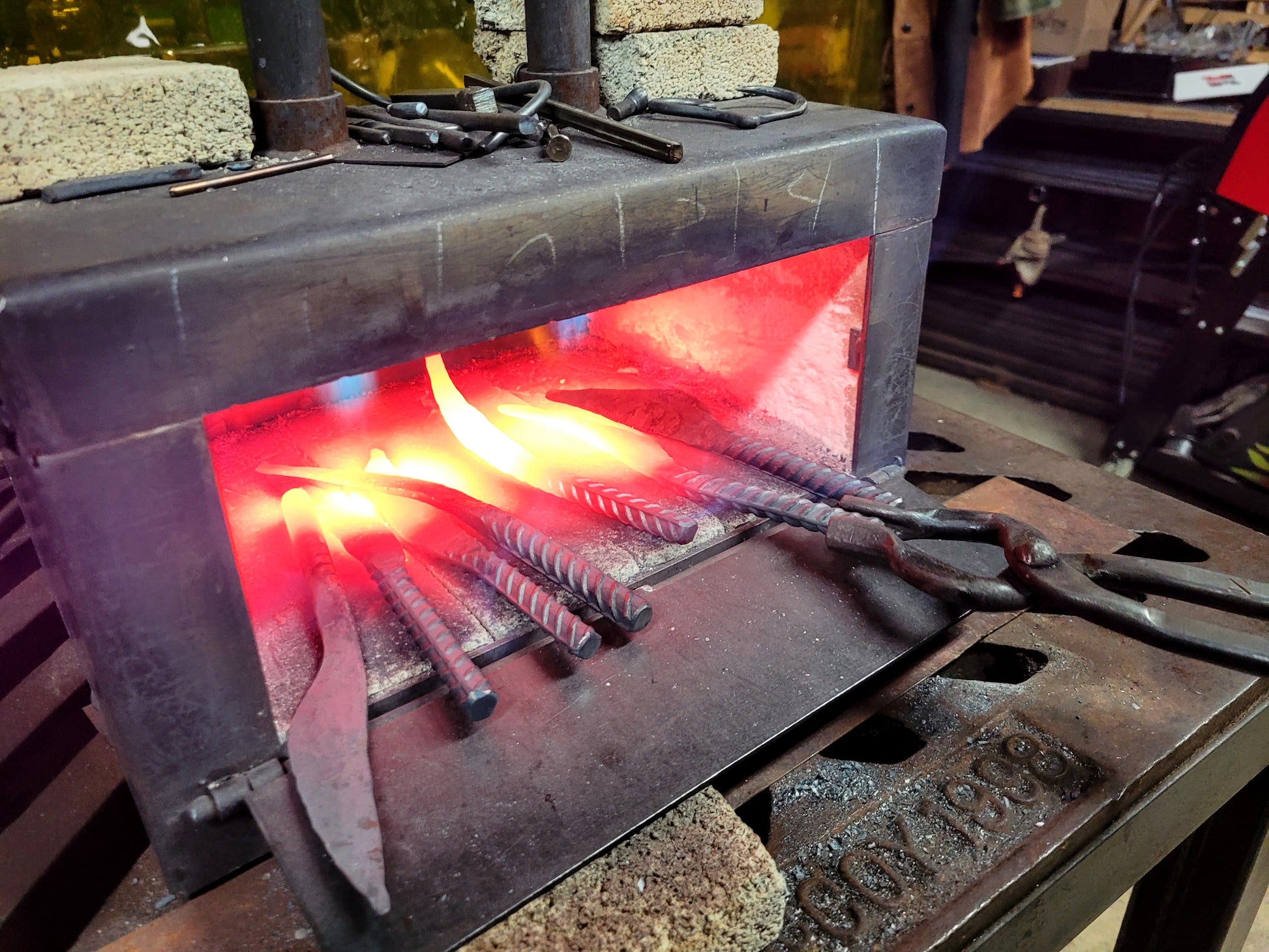 In this workshop you will work hands-on at the forge to learn the basics of knife-making using modern and traditional blacksmithing techniques. This workshop builds upon the basic skills learned in our Letter Opener Workshop, expanding into the more complex principles of bladesmithing. During the class you will design, forge, and harden your own rebar blade to take home. Perfect for the Forged In Fire enthusiast!