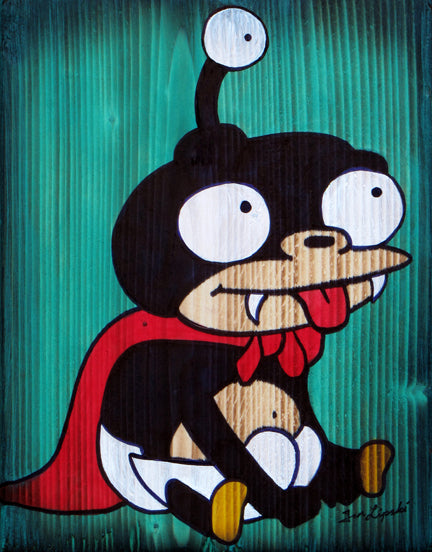 This handmade fan artwork is inspired by the popular television show Futurama. This artwork is painted on natural burned wood, incorporating a slightly rustic style into the design. Also check out our Bender and Hypnotoad wood paintings!