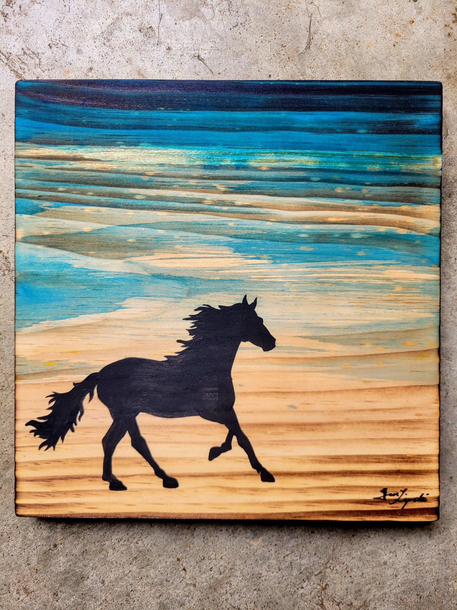 Run wild with this unique horse themed silhouette painting. Painted on natural wood, this beautiful horse painting would make a wonderful accent for your home, farm, or cottage.