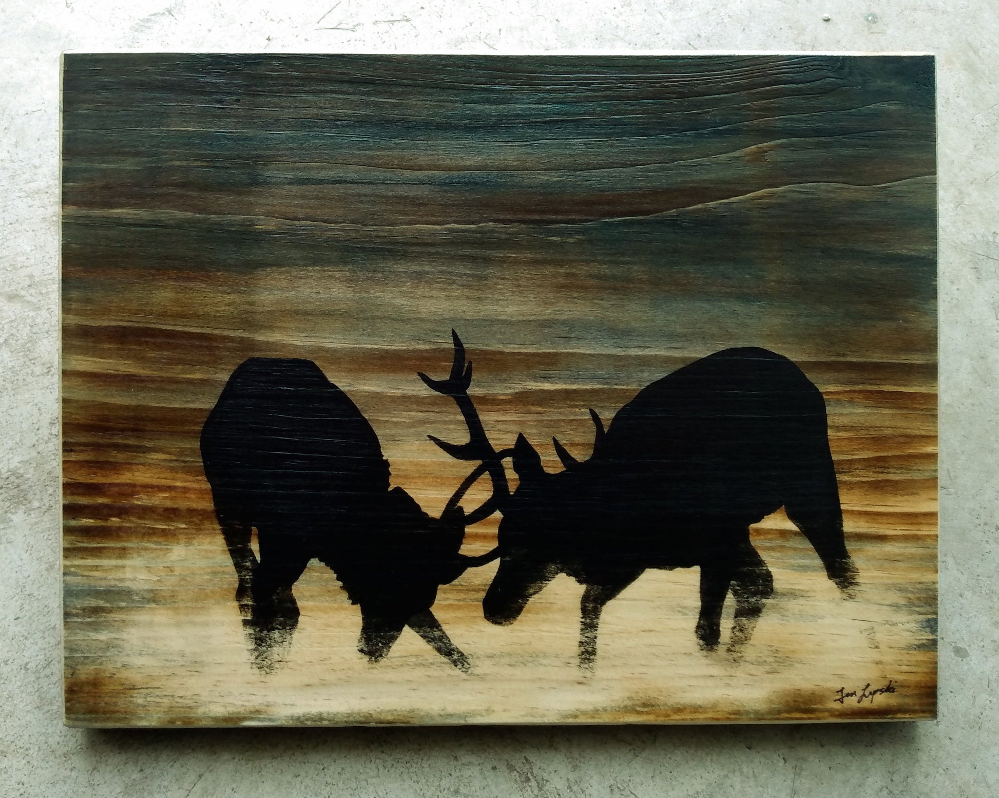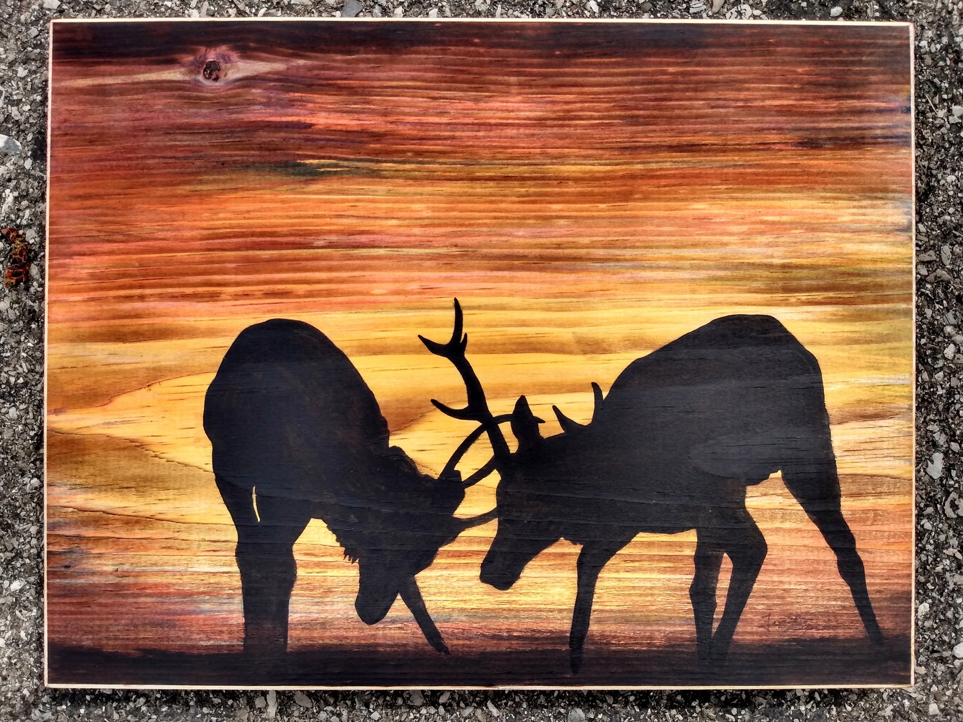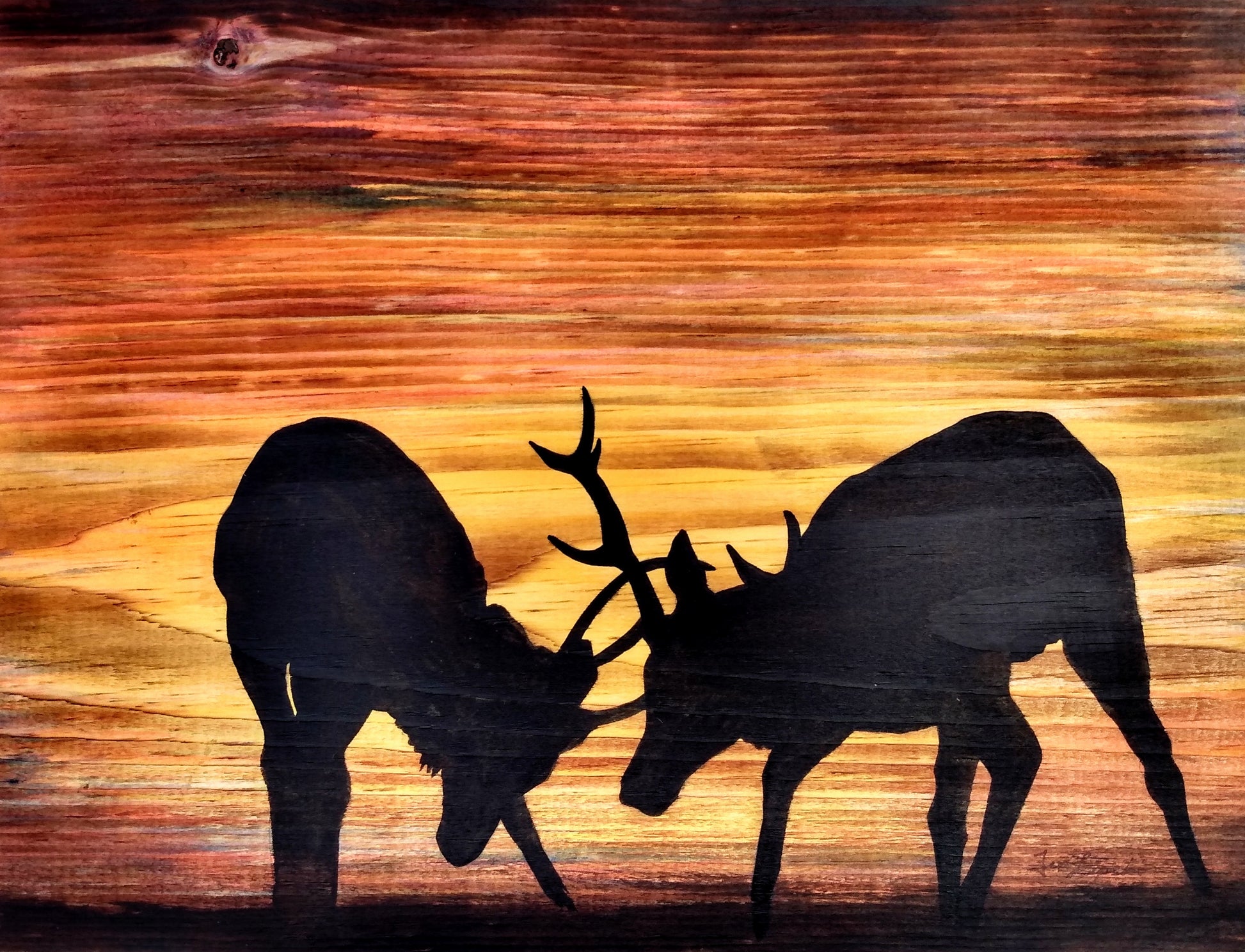 This original painting is burned, stained, and then finally painted onto a plank of unfinished wood. The artwork measures approximately 9 x 12 inches and includes hanging hardware. The colour wraps around the sides of the wood, and the painting is beveled and highlighted at the edges. No frame necessary, simply hang from a hook or nail on your wall!