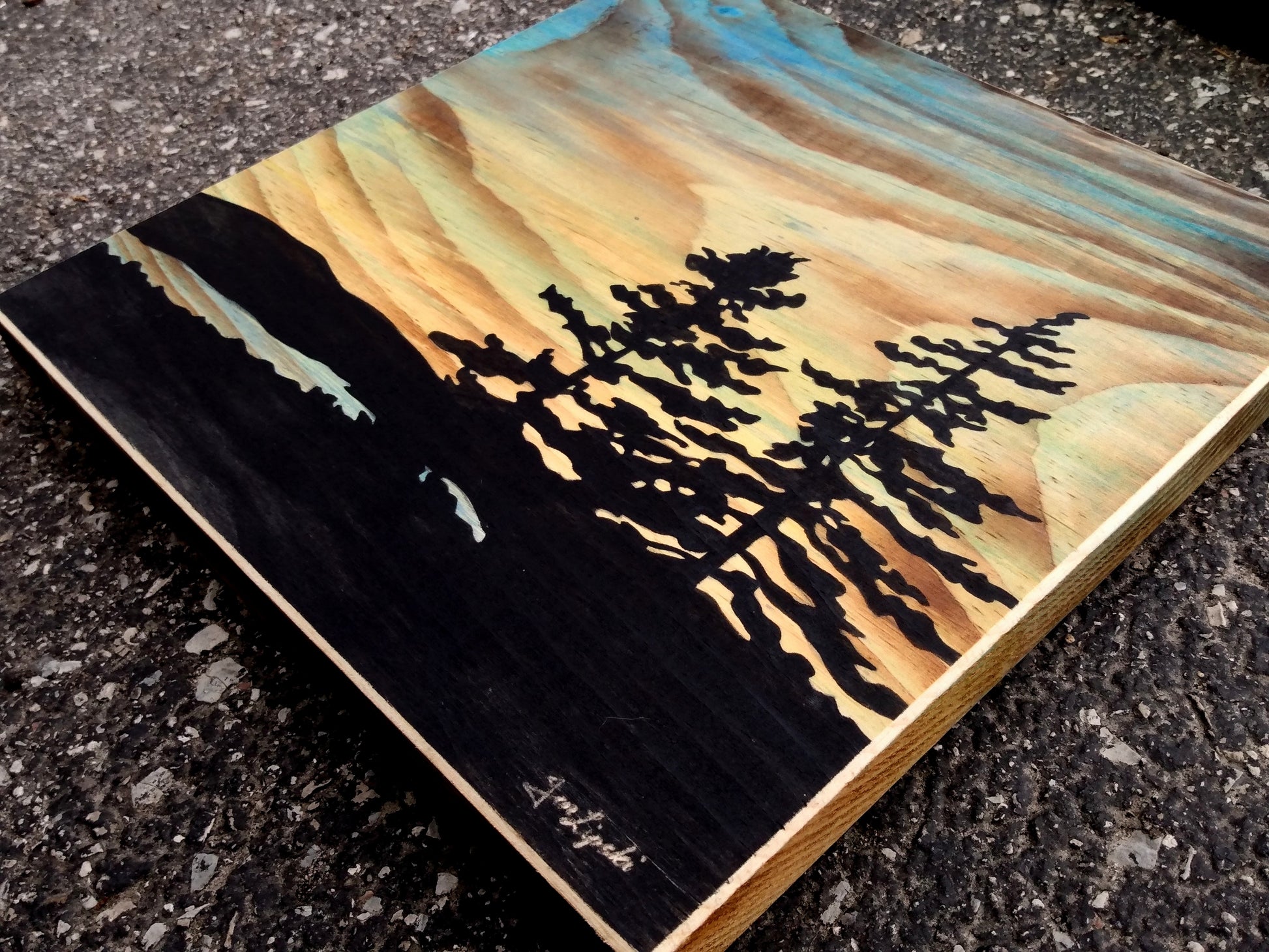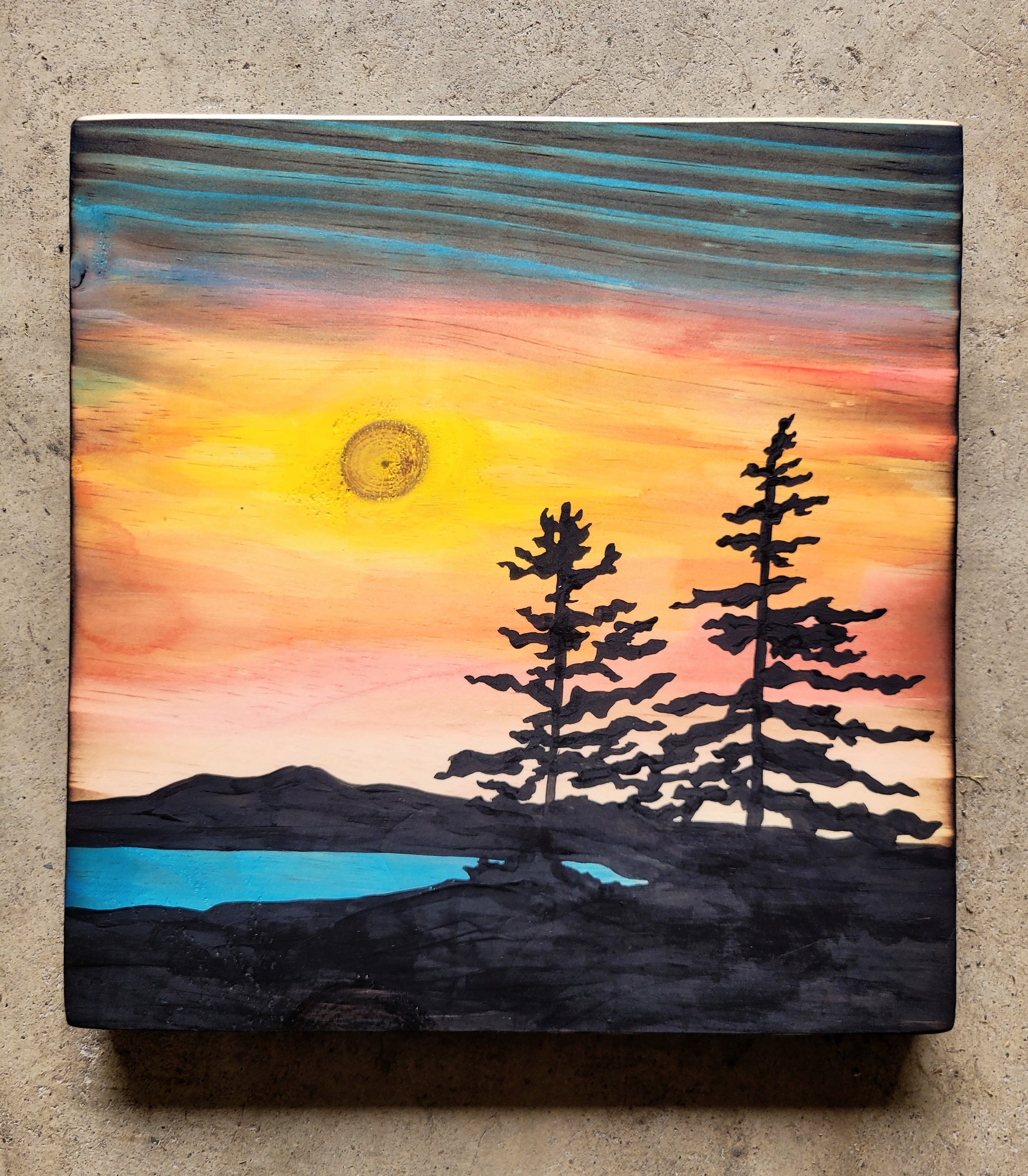 This original painting is burned, stained, and then finally painted onto a plank of unfinished wood. The artwork measures approximately 9 x 9 inches and includes hanging hardware. The colour wraps around the sides of the wood, and the painting is beveled and highlighted at the edges. No frame necessary, simply hang from a hook or nail on your wall