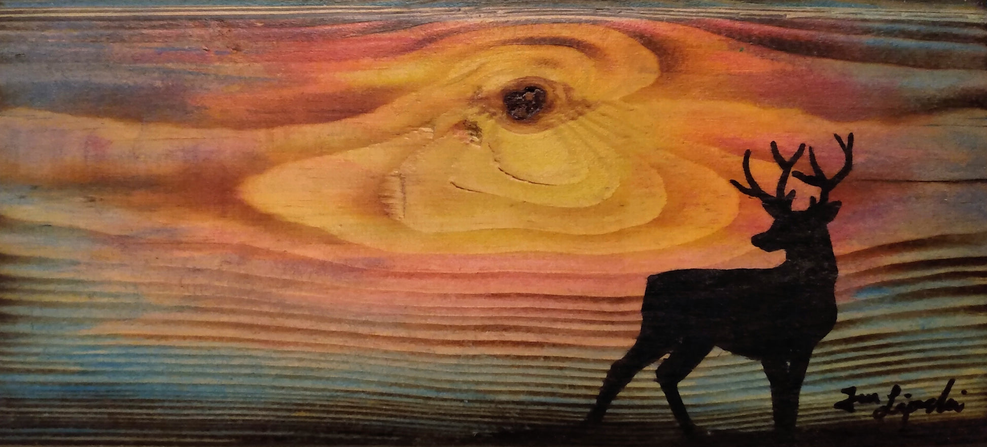 This small and unusual painting is burned, stained, and then painted onto a plank of reclaimed wood panelling. It measures approximately 4 x 8 inches and includes hardware for hanging. No frame necessary, simply hang from a hook or nail on your wall!