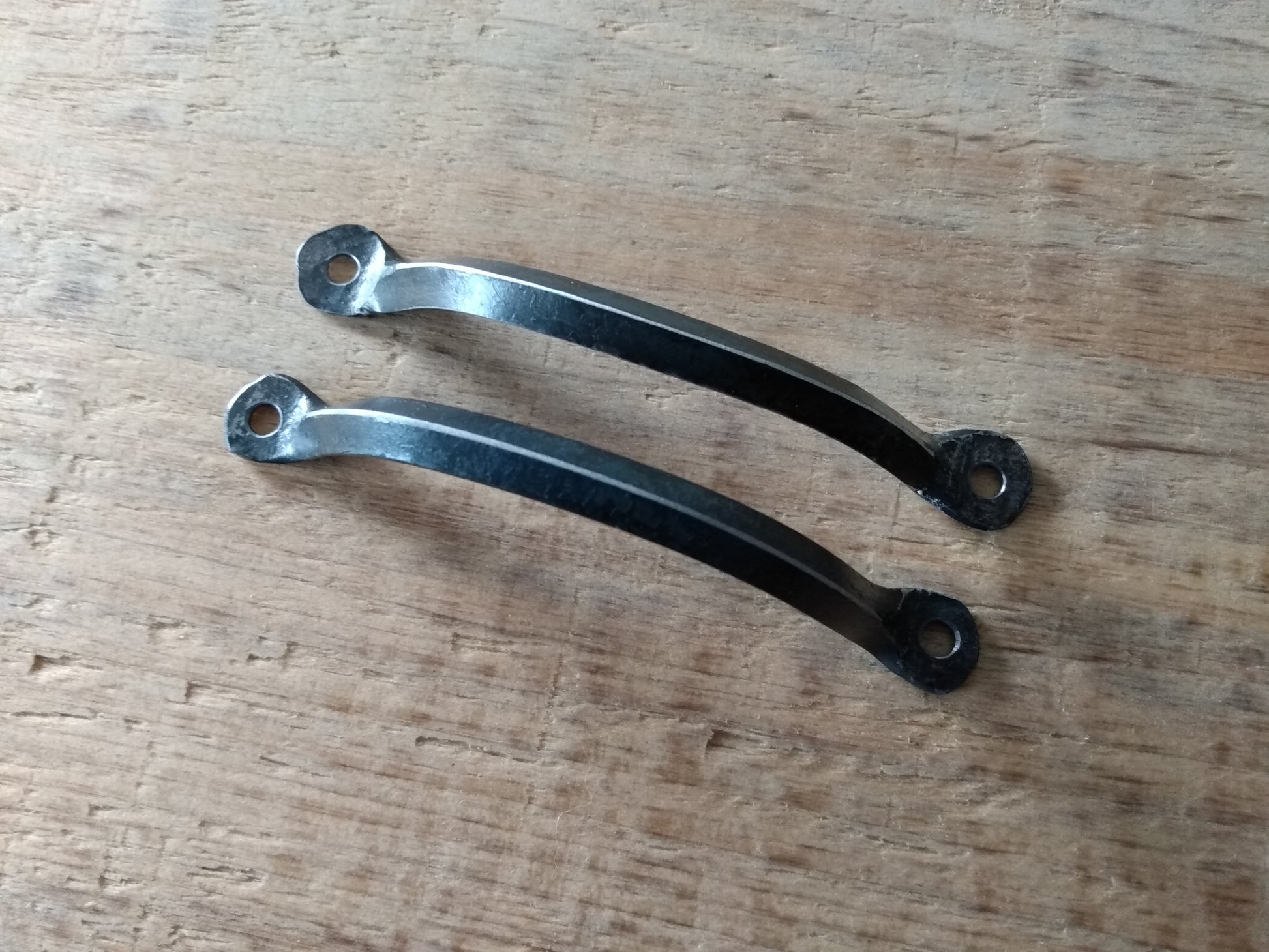These simple and elegant drawer pulls are hand forged and add a decorative artistic touch to update any space. Perfect for use in the kitchen to accent new cabinet facings or to spice up your existing decor on a budget. Also use these drawer pulls to update cabinets in the bedroom, bathroom, laundry room, or workshop, or for use in custom DIY projects like rustic wood serving trays!