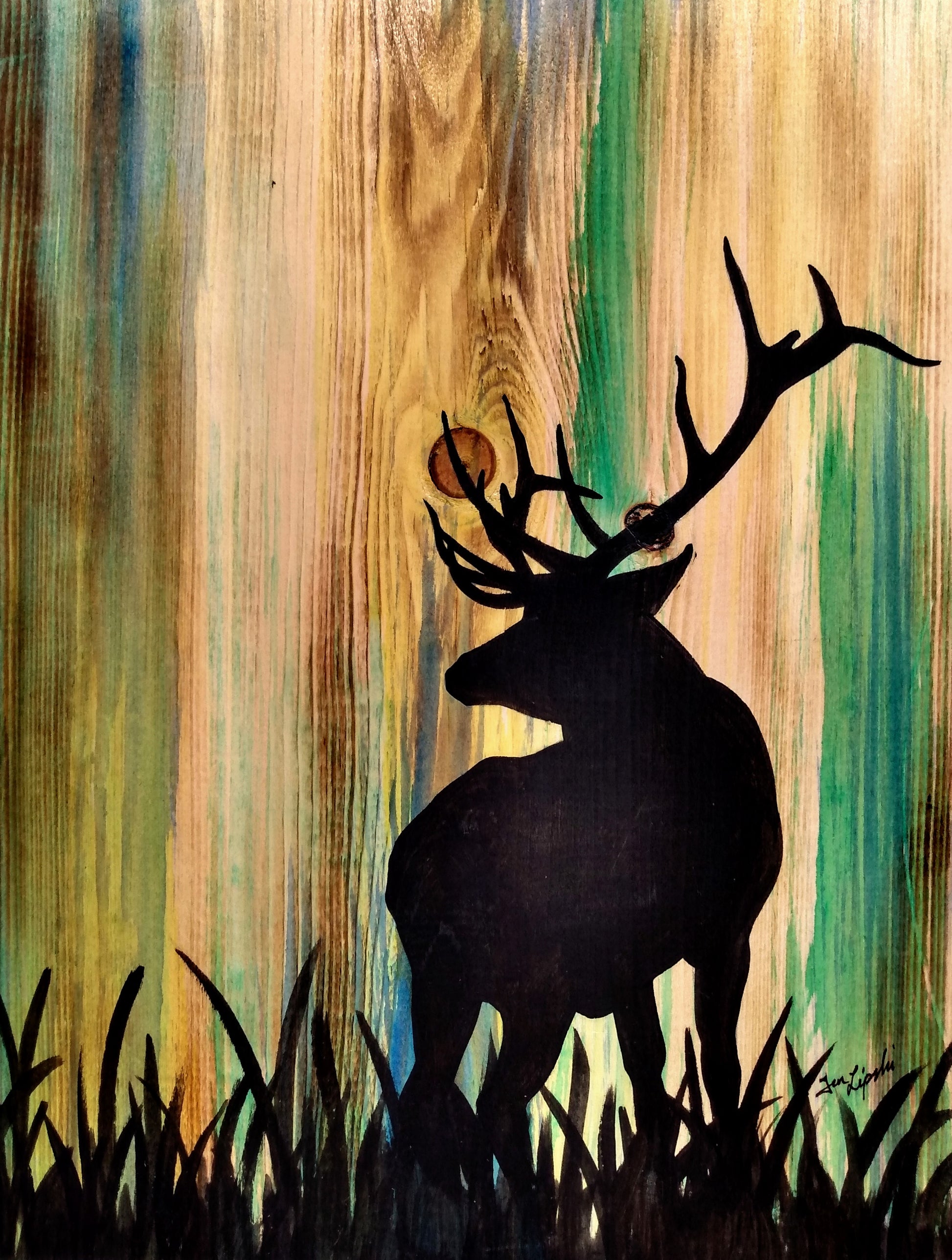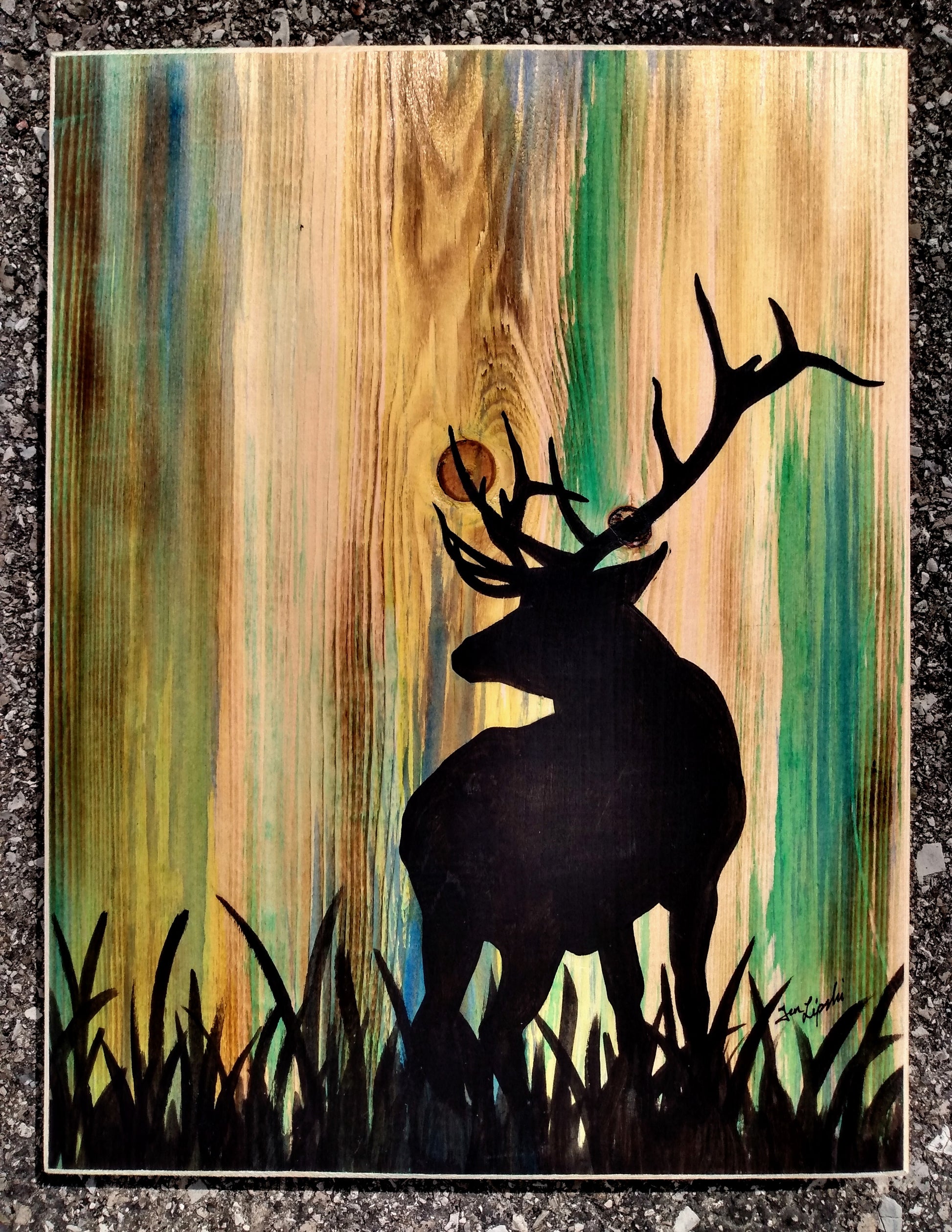 Bring the outdoors inside when you decorate your home or cottage with this unique stag silhouette, painted on natural wood.