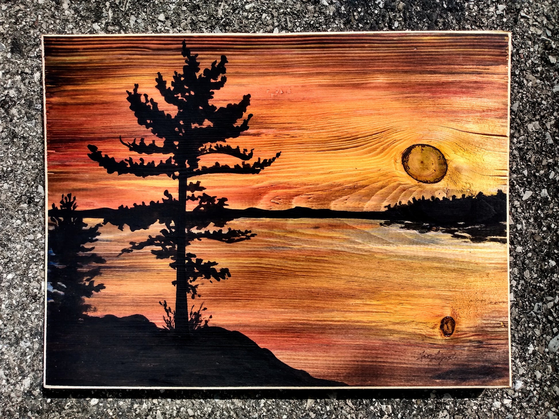 This original painting is burned, stained, and then finally painted onto a plank of unfinished wood. The artwork measures approximately 9 x 12 inches and comes ready to hang. The colour wraps around the sides of the wood, and the edges are beveled and highlighted to add the finishing touch. No frame necessary, simply hang from a hook or nail on your wall!