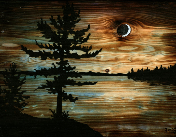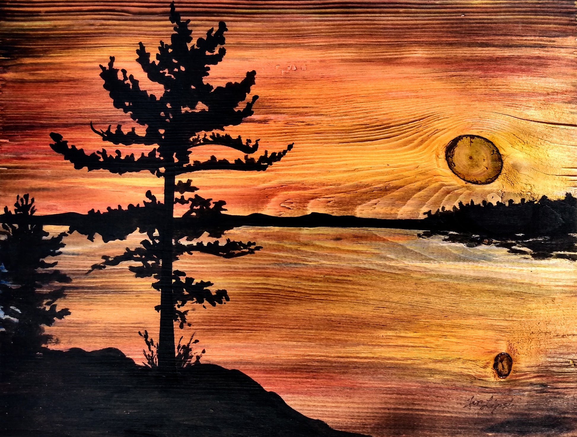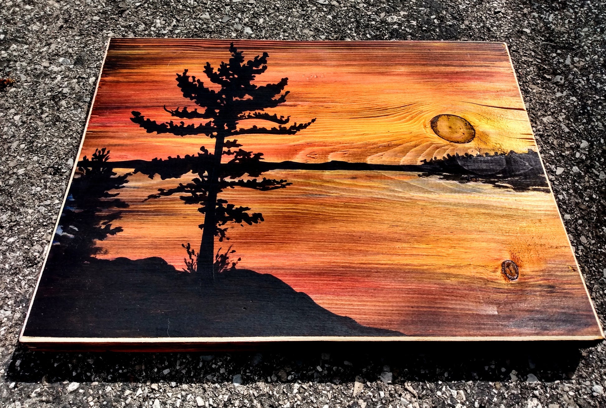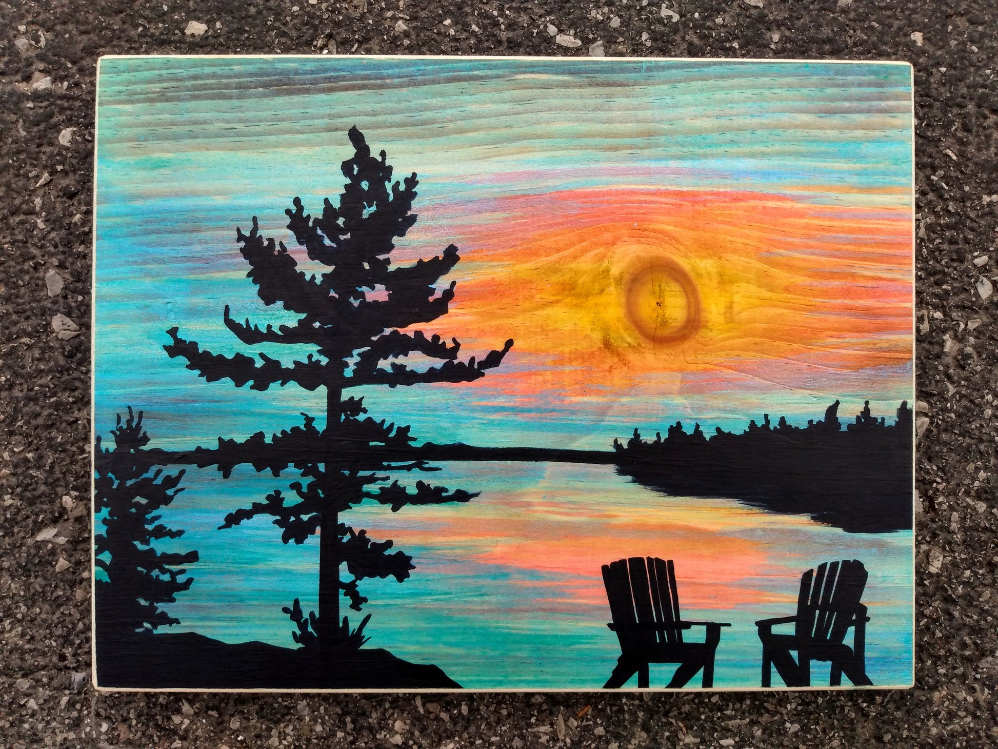 Celebrate the beauty of the natural world when you decorate your home or cottage with this unique Lake view silhouette, painted on natural wood.
