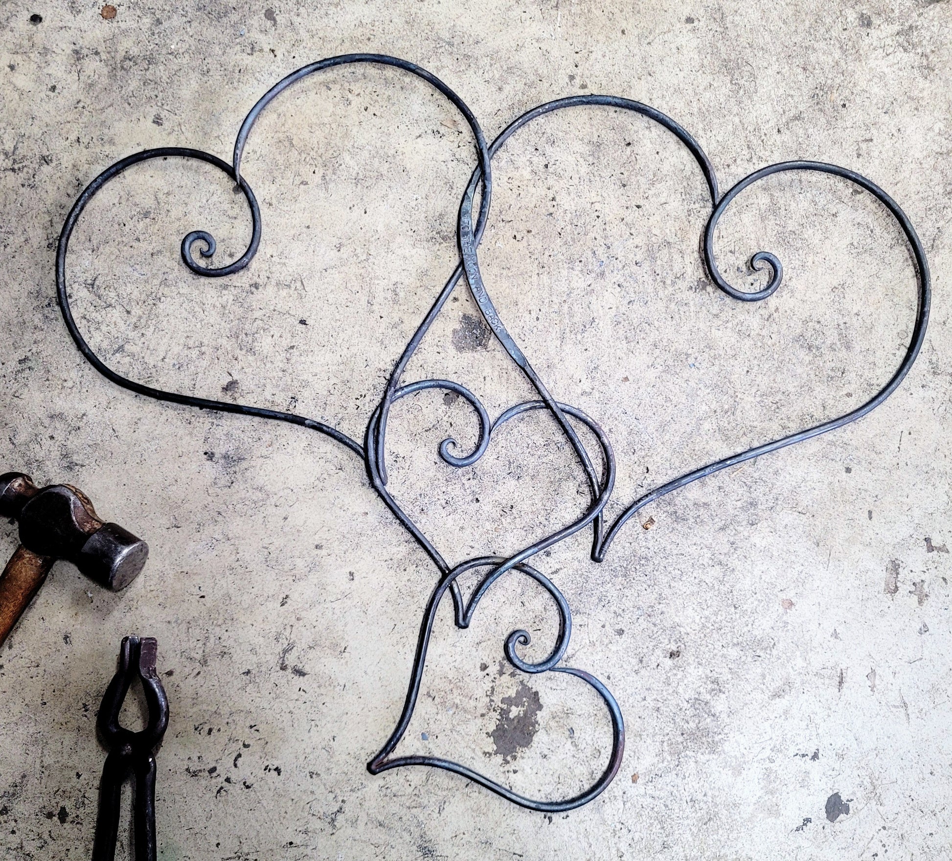 This custom set of linked hearts measures approximately 24" and is welded together to hang easily on the wall. This artwork includes a custom inscription in the metal and two hand-forged hooks to hang by