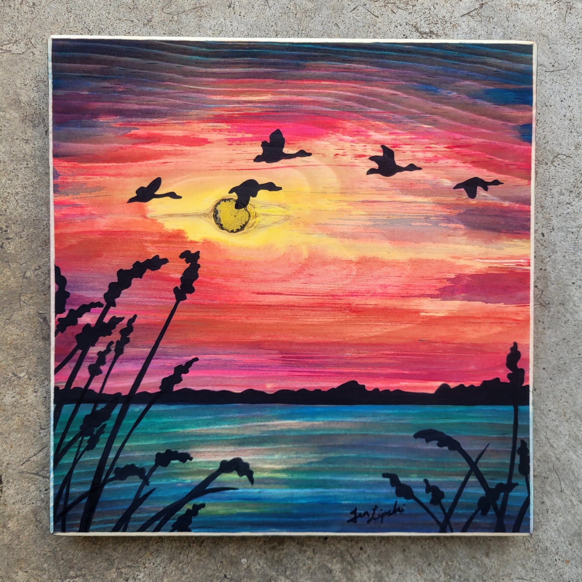 To craft this unique painting, the wood is first burned and stained to create a unique atmosphere to the scene before the final silhouette image is hand-painted over top to complete the design. The finished artwork is then sealed to protect the wood and the painting measures approximately 9 x 9 inches in size. The colour wraps around the sides of the wood with beveled and highlighted edges so no frame necessary, simply hang from a hook or nail on your wall!