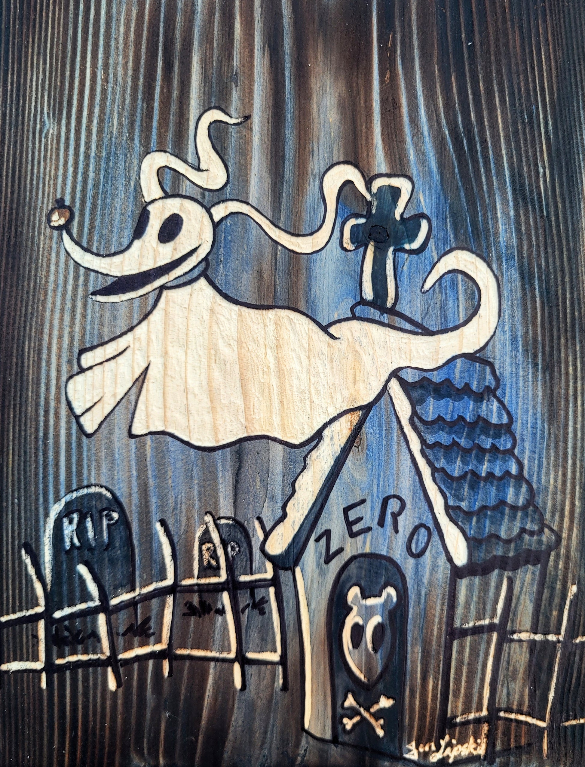 This handmade wood portrait of Zero (Inspired by Tim Burton's classic The Nightmare Before Christmas) is painted and carved on a plank of natural burned wood, adding a unique rustic flair to the design. Also check out our Jack Skellington, Sally, and Oogie Boogie wood artworks done in the same style!